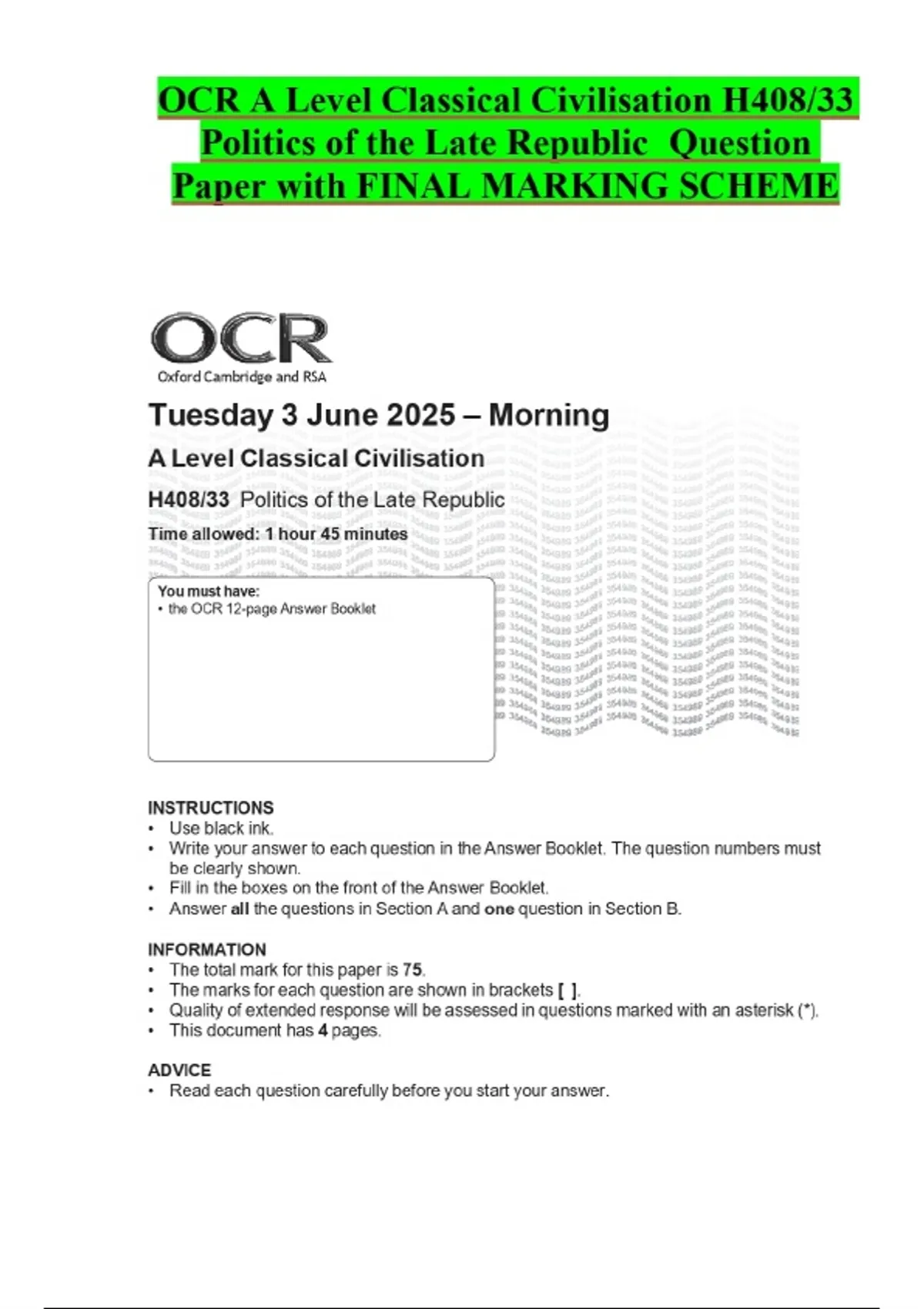 OCR A Level Classical Civilisation H408/33 Politics of the Late Republic Question Paper with FINAL MARKING SCHEME