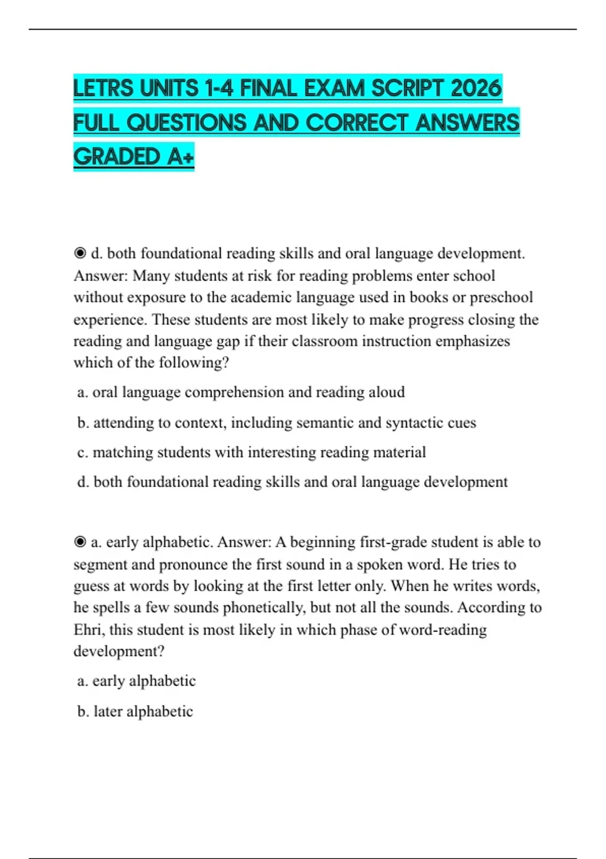 LETRS UNITS 1-4 FINAL EXAM SCRIPT 2026 FULL QUESTIONS AND CORRECT ANSWERS GRADED A+