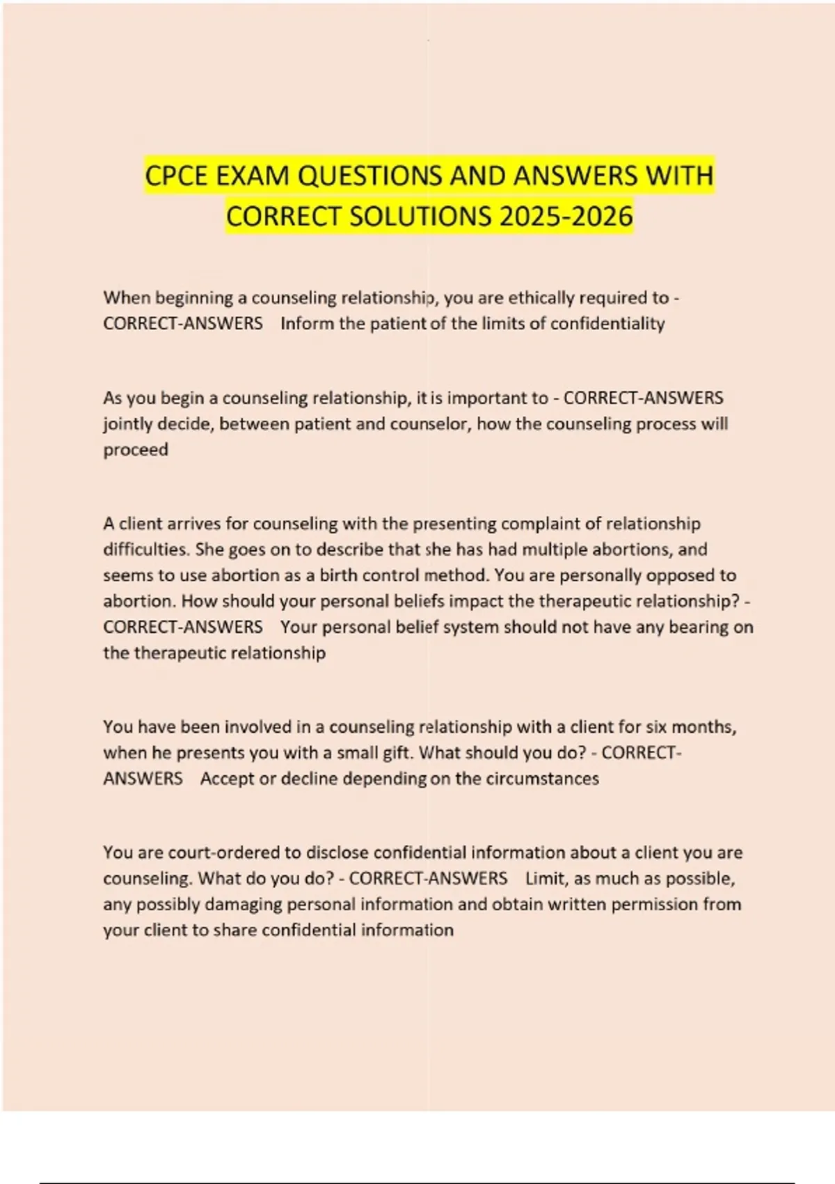 CPCE EXAM QUESTIONS AND ANSWERS WITH CORRECT SOLUTIONS When beginning a counseling relationship, you are ethically required to - CORRECT-ANSWERS Inform the patient of the limits of confidentiality As you begin a counseling relationship, it is important to - CORRECT-ANSWERS jointly decide, between patient and counselor, how the counseling process will proceed A client arrives for counseling with the presenting complaint of relationship difficulties. She goes on to describe that she has had multiple abortions, and seems to use abortion as a birth control method. You are personally opposed to abortion. How should your personal beliefs impact the therapeutic relationship? - CORRECT-ANSWERS Your personal belief system should not have any bearing on the therapeutic relationship