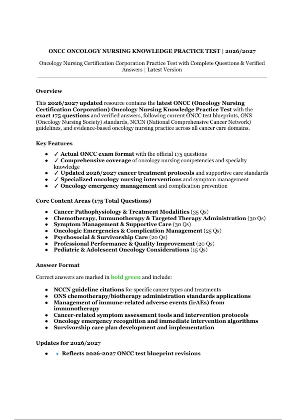 This document provides the verified ONCC Oncology Nursing Knowledge Practice Test for the 2026/2027 cycle, featuring complete practice questions with accurate, up-to-date answers. It reviews essential oncology nursing competencies, including cancer pathophysiology, treatment modalities, symptom management, patient education, pharmacologic therapies, and evidence-based supportive care. Designed for certification candidates, this resource strengthens oncology knowledge, enhances clinical judgement, and prepares nurses for ONCC credentialing requirements.