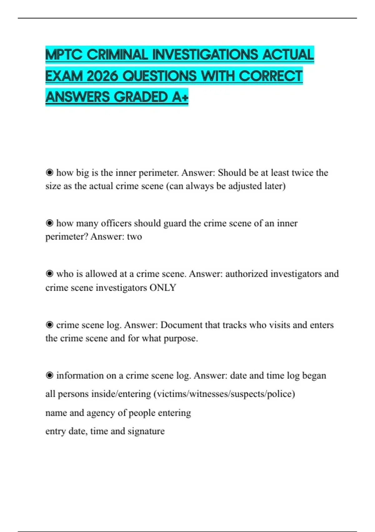 ◉ who is allowed at a crime scene. Answer: authorized investigators and