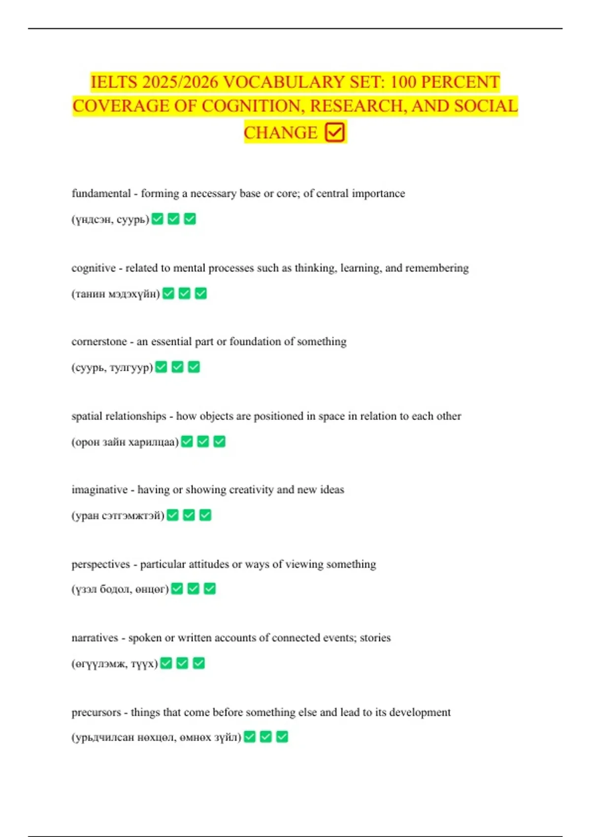 IELTS 2025/2026 VOCABULARY SET: 100 PERCENT COVERAGE OF COGNITION, RESEARCH, AND SOCIAL CHANGE