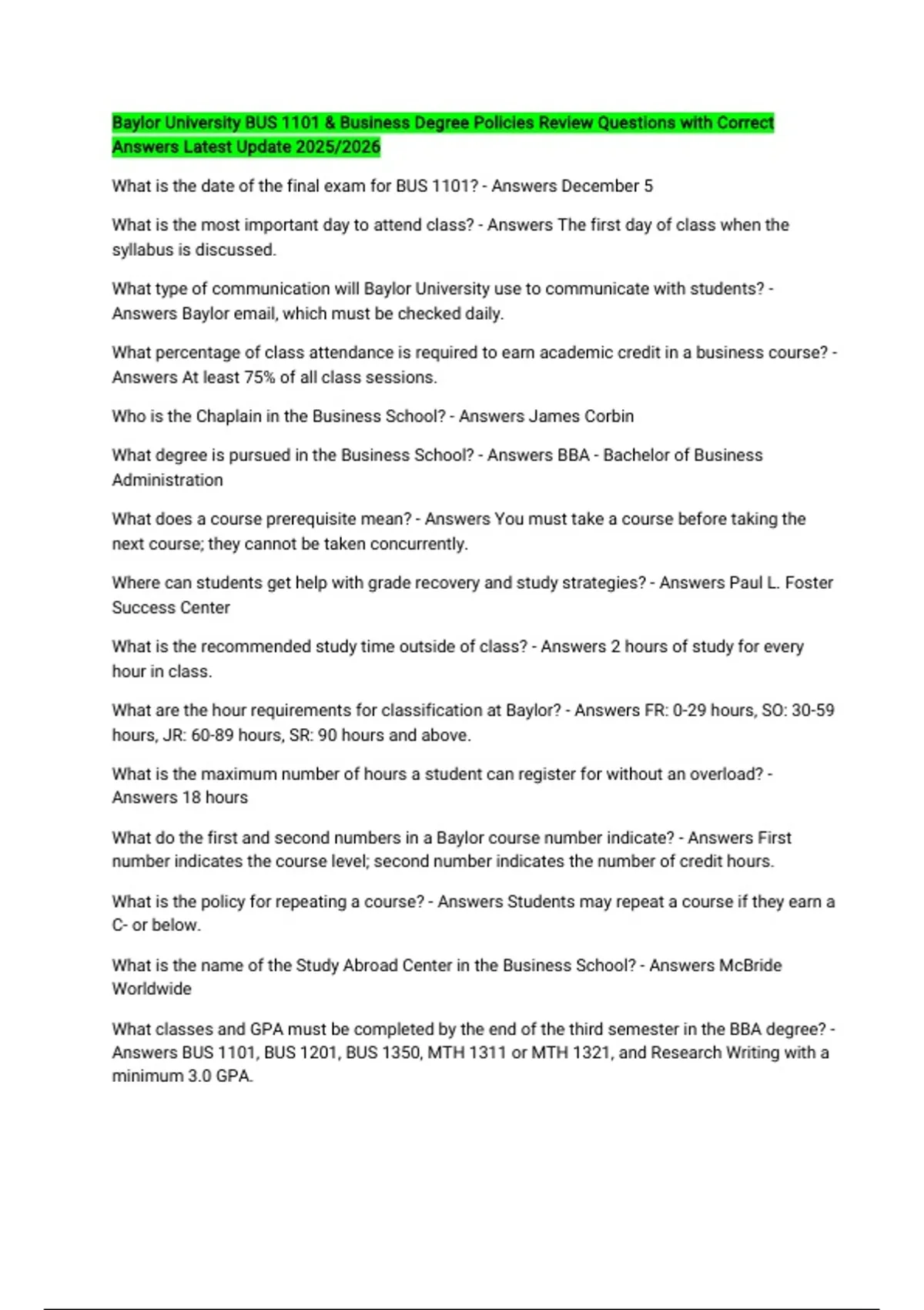Baylor University BUS 1101 & Business Degree Policies Review Questions with Correct Answers Latest Update 2025/2026 What is the date of the final exam for BUS 1101? - Answers December 5 What is the most important day to attend class? - Answers The first day of class when the syllabus is discussed. What type of communication will Baylor University use to communicate with students? - Answers Baylor email, which must be checked daily. What percentage of class attendance is required to earn academic credit in a business course? - Answers At least 75% of all class sessions. Who is the Chaplain in the Business School? - Answers James Corbin What degree is pursued in the Business School? - Answers BBA - Bachelor of Business Administration What does a course prerequisite mean? - Answers You must take a course before taking the next course; they cannot be taken concurrently. Where can students get help with grade recovery and study strategies? - Answers Paul L. Foster Success Center What is the recommended study time outside of class? - Answers 2 hours of study for every hour in class. What are the hour requirements for classification at Baylor? - Answers FR: 0-29 hours, SO: 30-59 hours, JR: 60-89 hours, SR: 90 hours and above. What is the maximum number of hours a student can register for without an overload? - Answers 18 hours What do the first and second numbers in a Baylor course number indicate? - Answers First number indicates the course level; second number indicates the number of credit hours. What is the policy for repeating a course? - Answers Students may repeat a course if they earn a C- or below. What is the name of the Study Abroad Center in the Business School? - Answers McBride Worldwide What classes and GPA must be completed by the end of the third semester in the BBA degree? - Answers BUS 1101, BUS 1201, BUS 1350, MTH 1311 or MTH 1321, and Research Writing with a minimum 3.0 GPA. What minimum grade must be earned in key courses by the end of the third semester? - Answers A minimum grade of C in each course. Can MTH 1311 be transferred from another school in summer? - Answers No, only the equivalent to MTH 1321 (Calculus I) can be transferred. What is the course retake policy for pre-business students? - Answers Earning three or more grades below a C in admission requirements disqualifies a student from the BBA degree. What happens if a pre-business student earns below a 3.0 GPA for more than one semester? - Answers They cannot remain in the BBA degree. What class must a student take if their GPA falls below 3.0 for the first time? - Ans