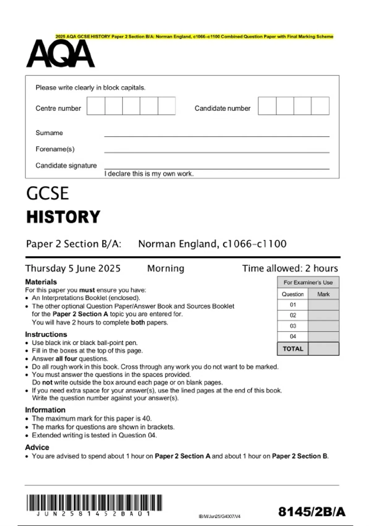 2025 AQA GCSE HISTORY Paper 2 Section B/A: Norman England, c1066–c1100 Combined Question Paper with Final Marking Scheme