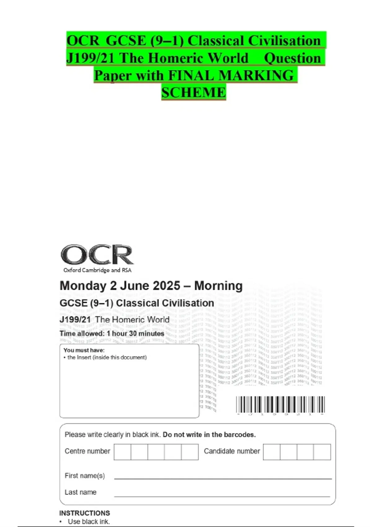 OCR GCSE (9–1) Classical Civilisation J199/21 The Homeric World Question Paper with FINAL MARKING SCHEME