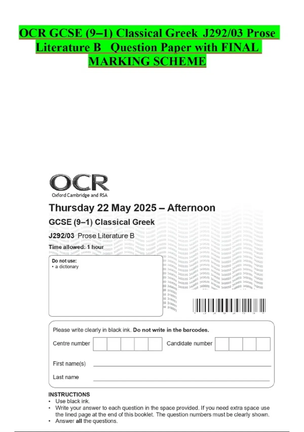 OCR GCSE (9–1) Classical Greek J292/03 Prose Literature B Question Paper with FINAL MARKING SCHEME