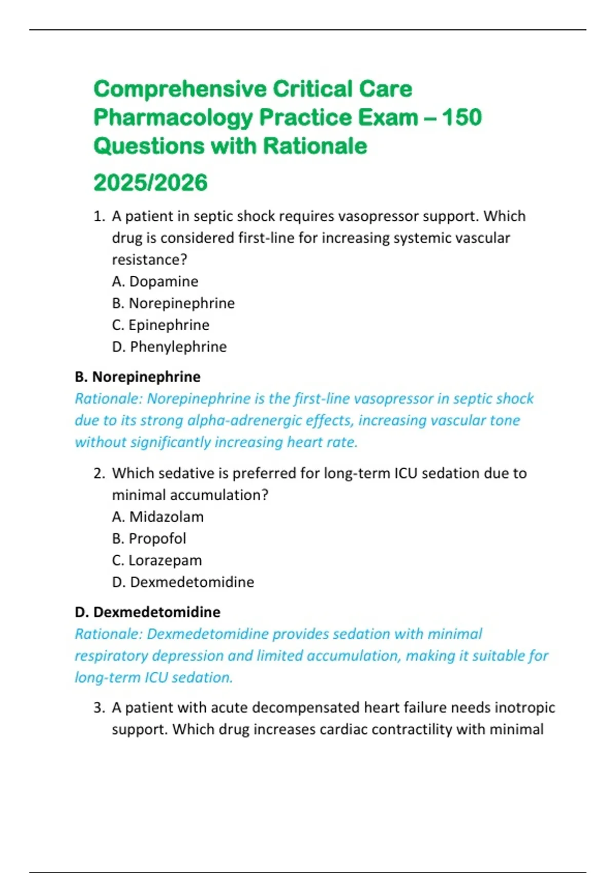 Comprehensive Critical Care Pharmacology Practice Exam – 150 Questions with Rationale 2025/2026