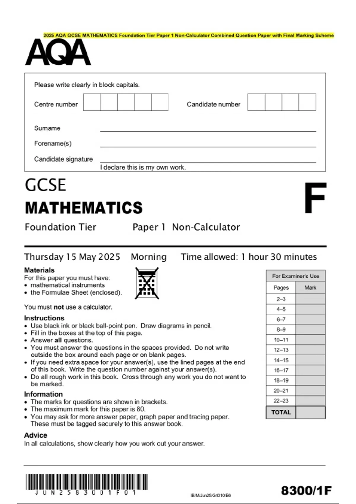 2025 AQA GCSE MATHEMATICS Foundation Tier Paper 1 Non-Calculator Combined Question Paper with Final Marking Scheme