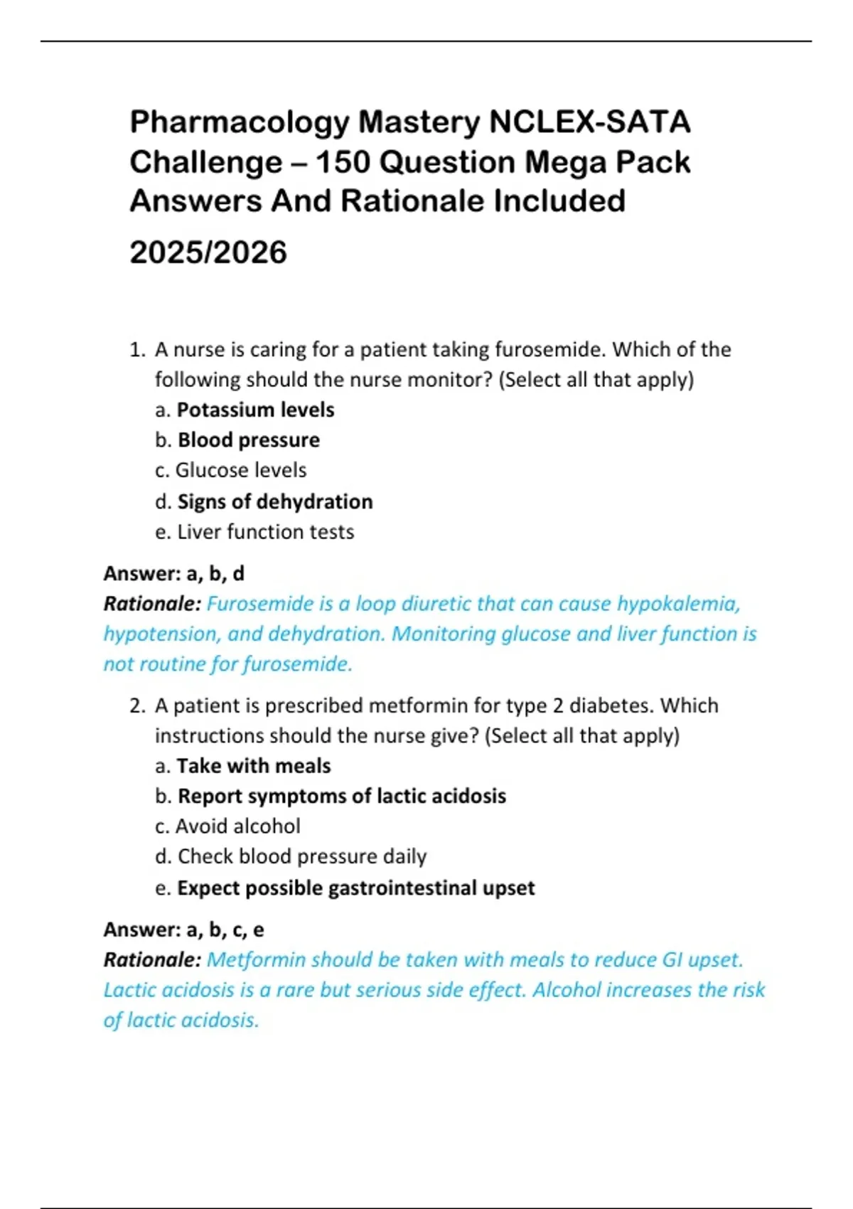 Pharmacology Mastery NCLEX-SATA Challenge – 150 Question Mega Pack Answers And Rationale Included 2025/2026