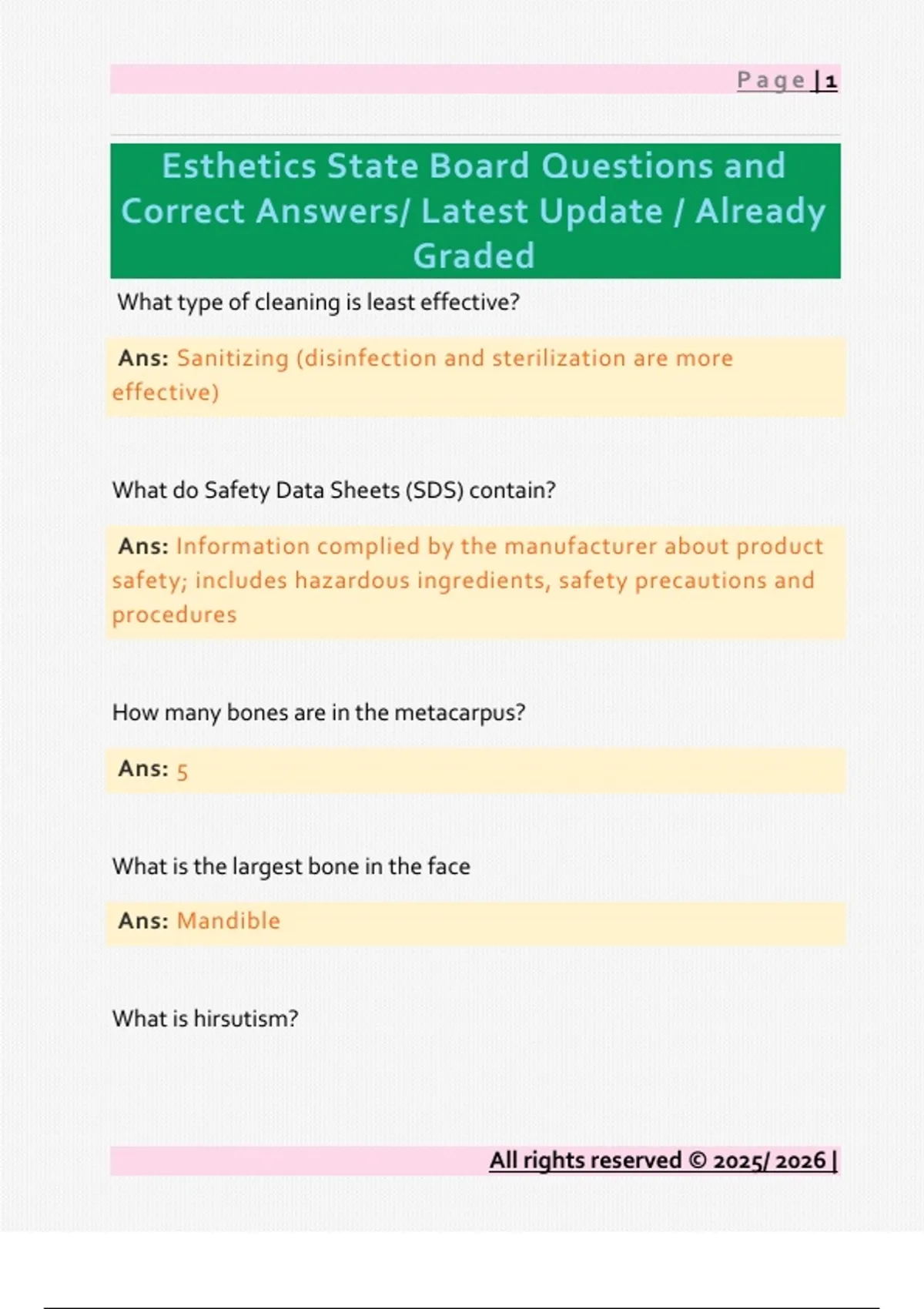 What type of cleaning is least effective? Ans: Sanitizing (disinfection and sterilization are more effective) What do Safety Data Sheets (SDS) contain? Ans: Information complied by the manufacturer about product safety; includes hazardous ingredients, safety precautions and procedures How many bones are in the metacarpus? Ans: 5 What is the largest bone in the face Ans: Mandible What is hirsutism? Page | 2 Ans: Excessive hair growth on the face, arms and legs...especially in women What skin type has small pores? Ans: Dry What is Staphlococci? Ans: A pus forming bacteria that grows in clusters causing abscesses, pustules and boils What makes oil and water mix? Ans: Emulsifiers are surfactants that cause oil and water to mix to form an emulsion What is the medical term for lice? Ans: Pediculosis capitis What is the burning ray? Ans: UVB All rights reserved © 2025/ 2026 | Page | 3 Who is the least/last to ag