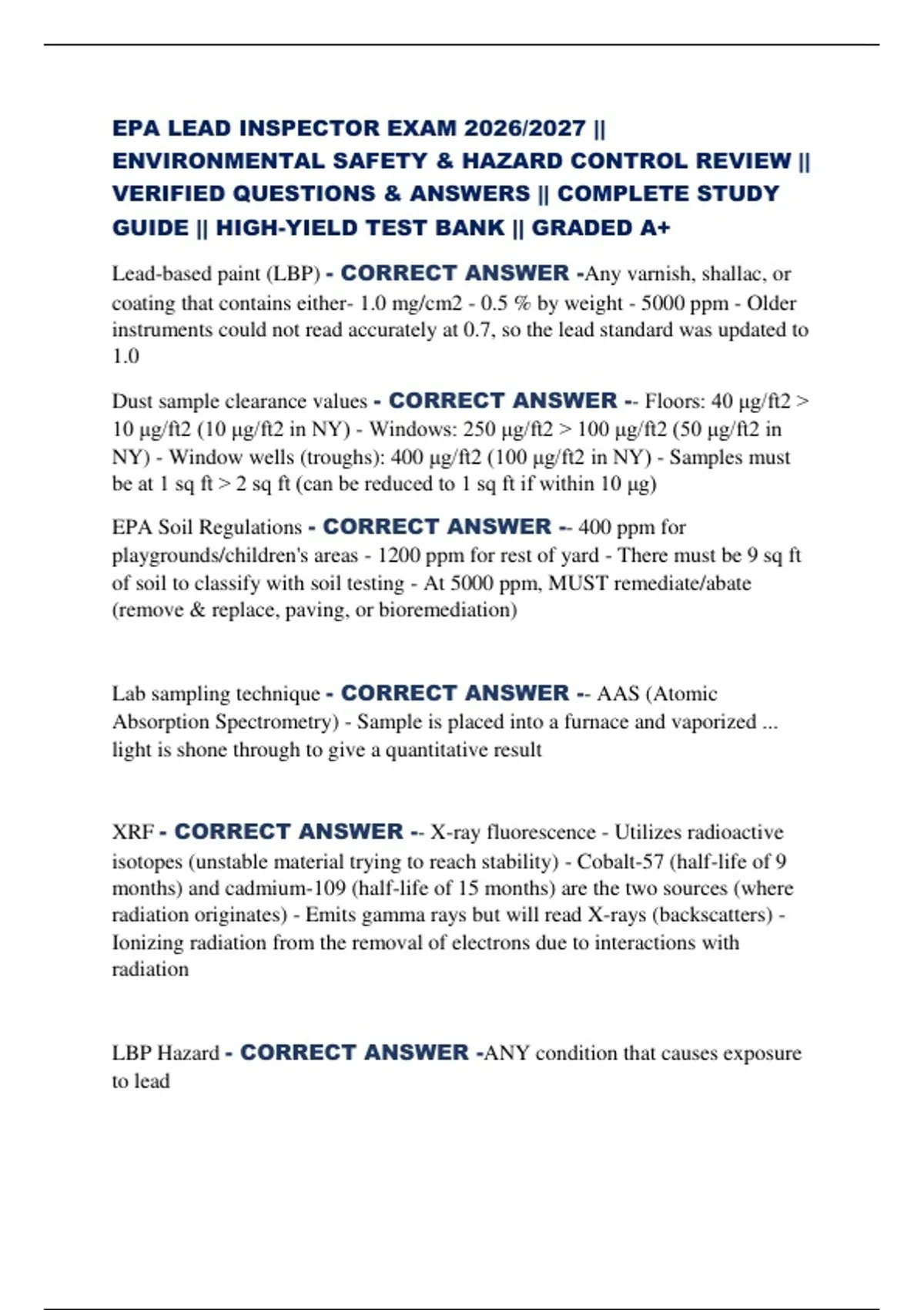 EPA LEAD INSPECTOR EXAM 2026/2027 || ENVIRONMENTAL SAFETY & HAZARD CONTROL REVIEW || VERIFIED QUESTIONS & ANSWERS || COMPLETE STUDY GUIDE || HIGH-YIELD TEST BANK || GRADED A+ Lead-based paint (LBP) - CORRECT ANSWER -Any varnish, shallac, or coating that contains either- 1.0 mg/cm2 - 0.5 % by weight - 5000 ppm - Older instruments could not read accurately at 0.7, so the lead standard was updated to 1.0 Dust sample clearance values - CORRECT ANSWER -- Floors: 40 μg/ft2 10 μg/ft2 (10 μg/ft2 in NY) - Windows: 250 μg/ft2 100 μg/ft2 (50 μg/ft2 in NY) - Window wells (troughs): 400 μg/ft2 (100 μg/ft2 in NY) - Samples must be at 1 sq ft 2 sq ft (can be reduced to 1 sq ft if within 10 μg) EPA Soil Regulations - CORRECT ANSWER -- 400 ppm for playgrounds/children's areas - 1200 ppm for rest of yard - There must be 9 sq ft of soil to classify with soil testing - At 5000 ppm, MUST remediate/abate (remove & replace, paving, or bioremediation)