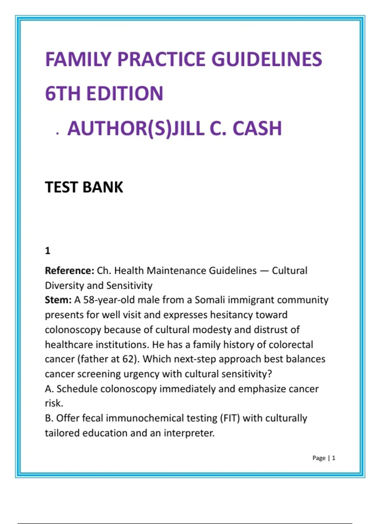 Family Practice Guidelines 6th Edition Test Bank — 2025 FNP & PA Review | 50 MCQs/Chapter • Verified Answers & Rationales 2) SEO Product Description (200–300 words) Dominate your primary-care exams with the Family Practice Guidelines, 6th Edition (Jill C. Cash) — 2025 Complete Test Bank. This digital, evidence-based package delivers 50 high-quality MCQs per chapter, clinically verified answers, and concise rationales crafted for NP/PA students and practicing clinicians preparing for boards, clinical exams, and OSCEs. Designed by nursing-science subject-matter experts and aligned to Family Practice Guidelines (2025), every item emphasizes differential diagnosis, guideline-based management, red-flag detection, and real-world primary care decision-making. Learner outcomes: improved diagnostic reasoning, faster guideline application, stronger prioritization skills, and measurable exam score gains (designed to support 90–100% score improvement when used systematically with our study plan). Ideal for FNP, AGNP, PA programs, primary care rotations, and board prep. Fast features at a glance: Full chapter-by-chapter coverage — updated 2025 content 50 clinically rigorous MCQs per chapter (A–D) Verified correct answers with evidence-based rationales NP/PA-style clinical application and differential reasoning items Printable practice sets, answer key, and study roadmap OSCE-appropriate scenarios and high-discrimination items Instant digital download — ready for self-study or classroom use Authority: built around Family Practice Guidelines (6th Ed.) — a nationally recognized standard in primary care education. Use this test bank to sharpen clinical judgment, accelerate board readiness, and convert guideline knowledge into exam success. 3) 8 High-Value SEO Keywords Family Practice Guidelines test bank 2025 FNP test bank primary care MCQs verified answers rationales FNP board prep questions PA clinical exam practice primary care NP questions guideline-based exam prep 4) 10 Hashtags #FamilyPracticeTestBank #FNP2025 #PrimaryCareMCQs #PAExamPrep #VerifiedRationales #GuidelineBasedStudy #NPBoardPrep #ClinicalReasoning #OSCEPractice #FamilyPracticeGuidelines