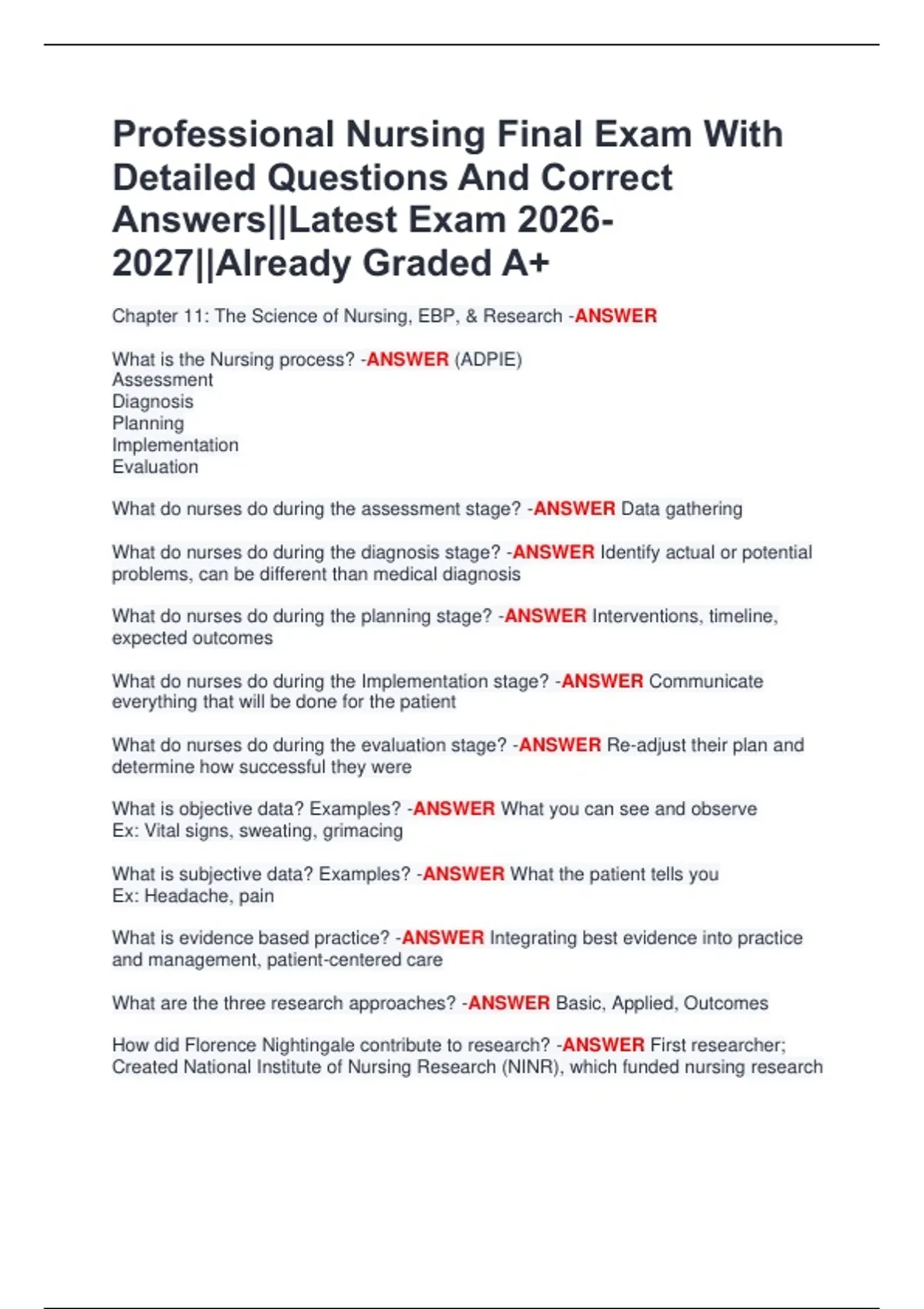 Professional Nursing Final Exam With Detailed Questions And Correct Answers||Latest Exam 2026 2027||Already Graded A+