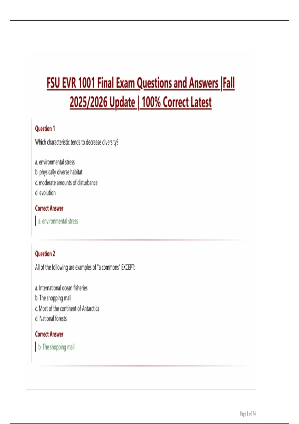 FSU EVR 1001 Final Exam Questions and Answers |Fall