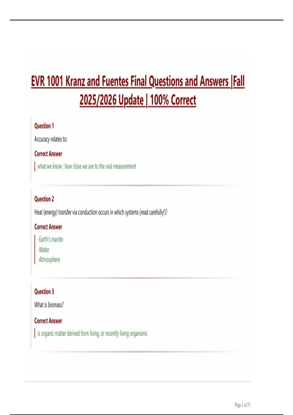 EVR 1001 Kranz and Fuentes Final Questions and Answers |Fall