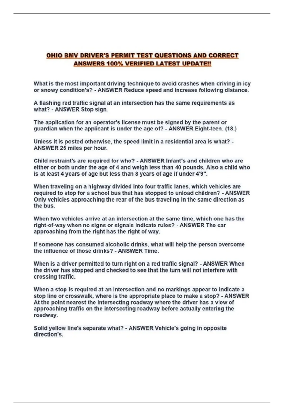 OHIO BMV DRIVER'S PERMIT TEST QUESTIONS AND CORRECT ANSWERS 100% VERIFIED LATEST UPDATE!!...