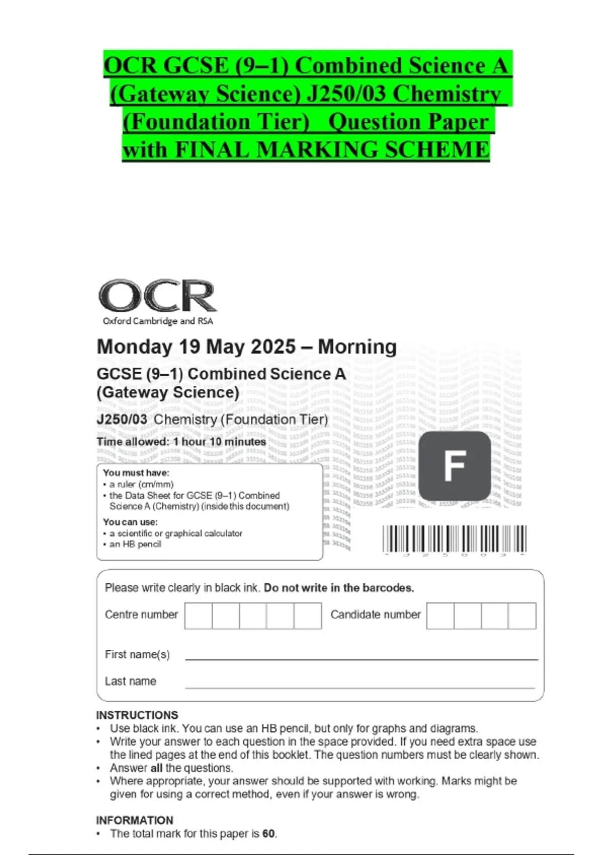 OCR GCSE (9–1) Combined Science A (Gateway Science) J250/03 Chemistry (Foundation Tier) Question Paper with FINAL MARKING SCHEME