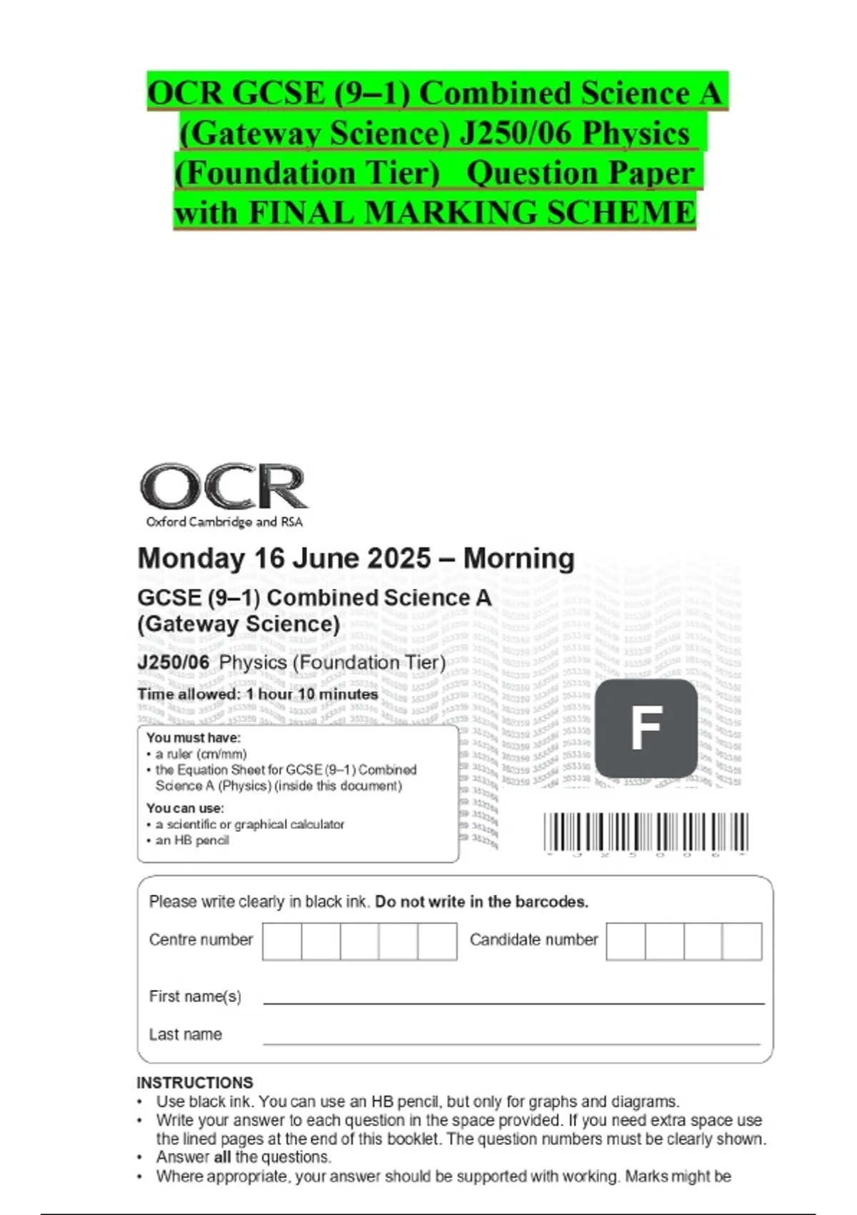OCR GCSE (9–1) Combined Science A (Gateway Science) J250/06 Physics (Foundation Tier) Question Paper with FINAL MARKING SCHEME