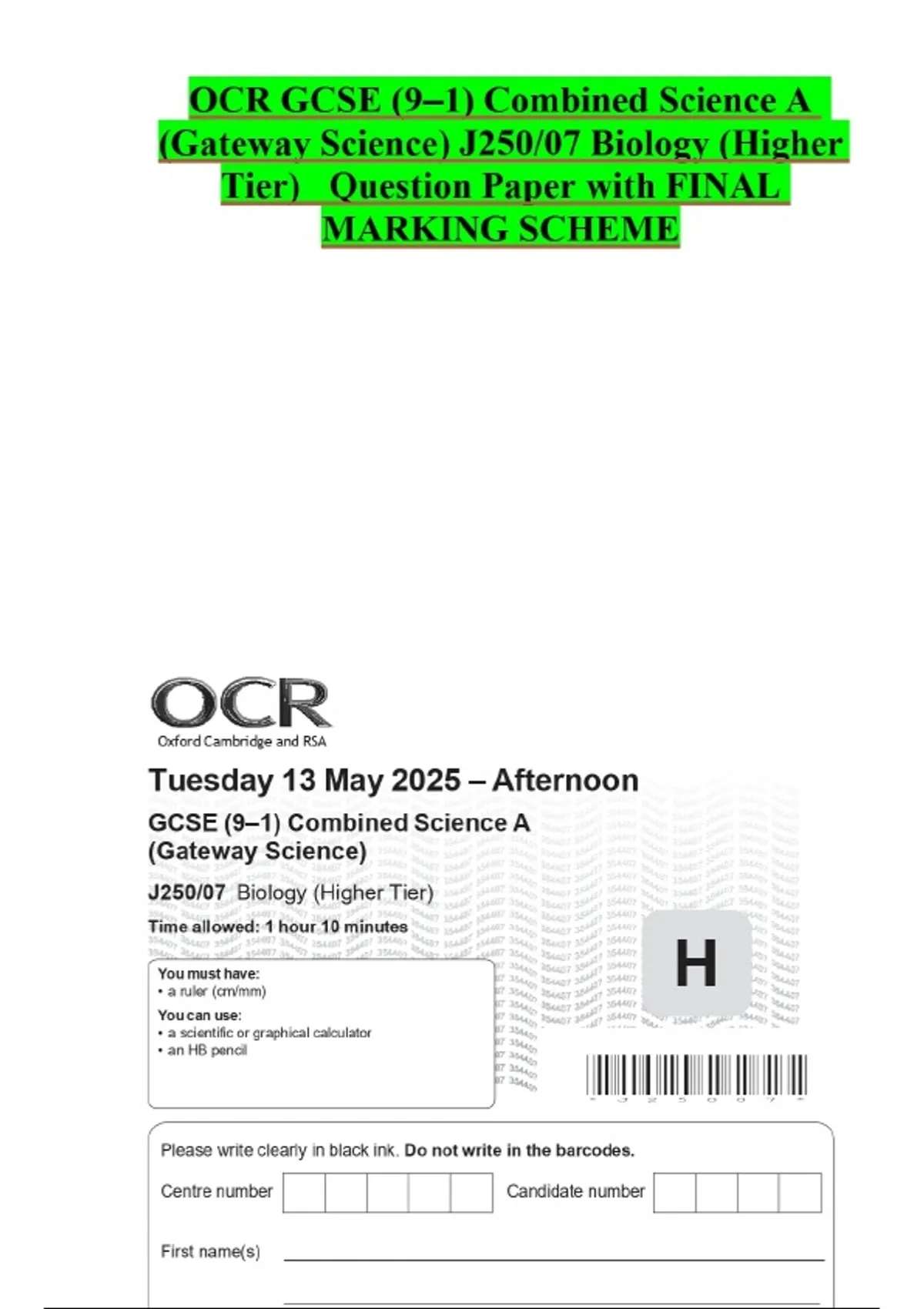 OCR GCSE (9–1) Combined Science A (Gateway Science) J250/07 Biology (Higher Tier) Question Paper with FINAL MARKING SCHEME