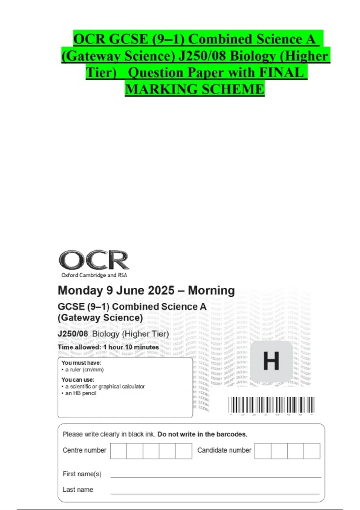 OCR GCSE (9–1) Combined Science A (Gateway Science) J250/08 Biology (Higher Tier) Question Paper with FINAL MARKING SCHEME