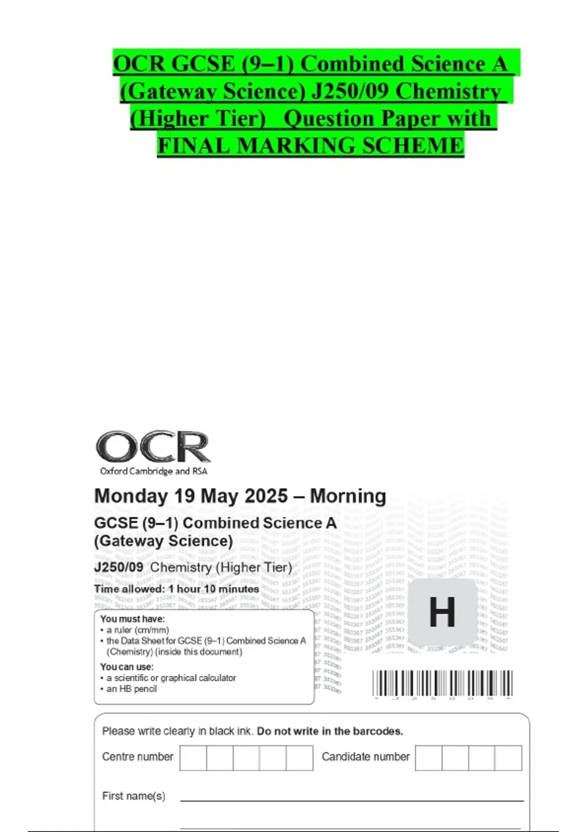 OCR GCSE (9–1) Combined Science A (Gateway Science) J250/08 Biology (Higher Tier) Question Paper with FINAL MARKING SCHEME