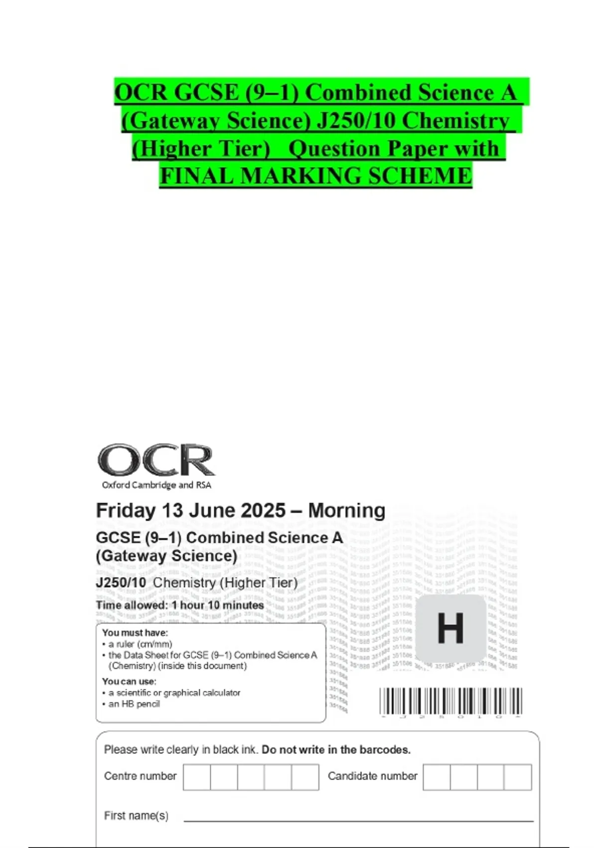 OCR GCSE (9–1) Combined Science A (Gateway Science) J250/10 Chemistry (Higher Tier) Question Paper with FINAL MARKING SCHEME