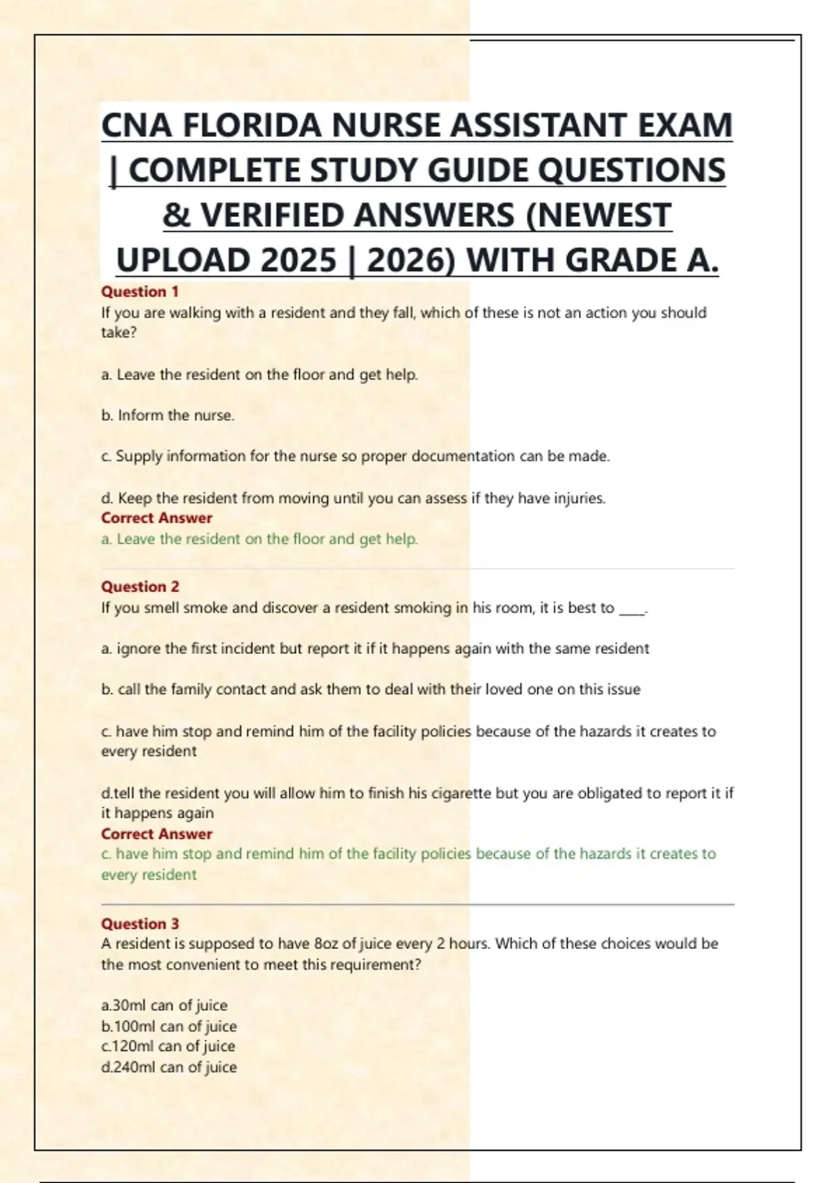 Question 1 If you are walking with a resident and they fall, which of these is not an action you should take? a. Leave the resident on the floor and get help. b. Inform the nurse. c. Supply information for the nurse so proper documentation can be made. d. Keep the resident from moving until you can assess if they have injuries. Correct Answer a. Leave the resident on the floor and get help. Question 2 If you smell smoke and discover a resident smoking in his room, it is best to ____. a. ignore the first incident but report it if it happens again with the same resident b. call the family contact and ask them to deal with their loved one on this issue c. have him stop and remind him of the facility policies because of the hazards it creates to every resident the resident you will allow him to finish his cigarette but you are obligated to report it if it happens again Correct Answer c. have him stop and remind him of the facility policies because of the hazards it creates to every resident Question 3 A resident is supposed to have 8oz of juice every 2 hours. Which of these choices would be the most convenient to meet this requirement? a.30ml can of juice b.100ml can of juice c.120ml can of juice d.240ml can of juice Correct Answer d.240ml can of juice Question 4 All of these might be used in dealing with contractures except ____. a. hand roll b. repositioning c. bandaging d. physical therapy Correct Answer c. bandaging Question 5 Hypertension is a medical term for ____. a. tense muscles b. high anxiety c. hyperactivity d. high blood pressure Correct Answer d. high blood pressure Question 6 To minimize the spread of bacteria, further infection and contamination, which procedure should be used for washing the perineum of a resident with a catheter? a. Wash from the rectum to the meatus b. Wash from the rectum to the scrotum. c. Wash from the meatus out. d. Wash with peroxide. Correct Answer c. Wash from the meatus out.