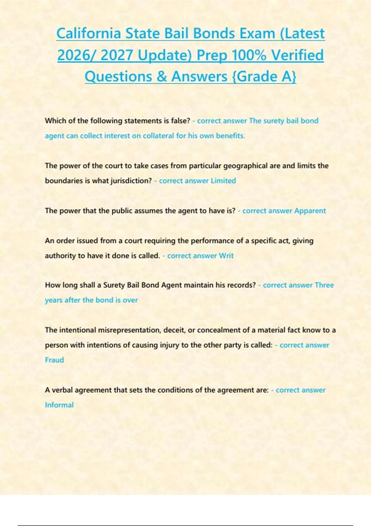 California State Bail Bonds Exam (Latest 2026/ 2027 Update) Prep 100% Verified Questions & Answers {Grade A}