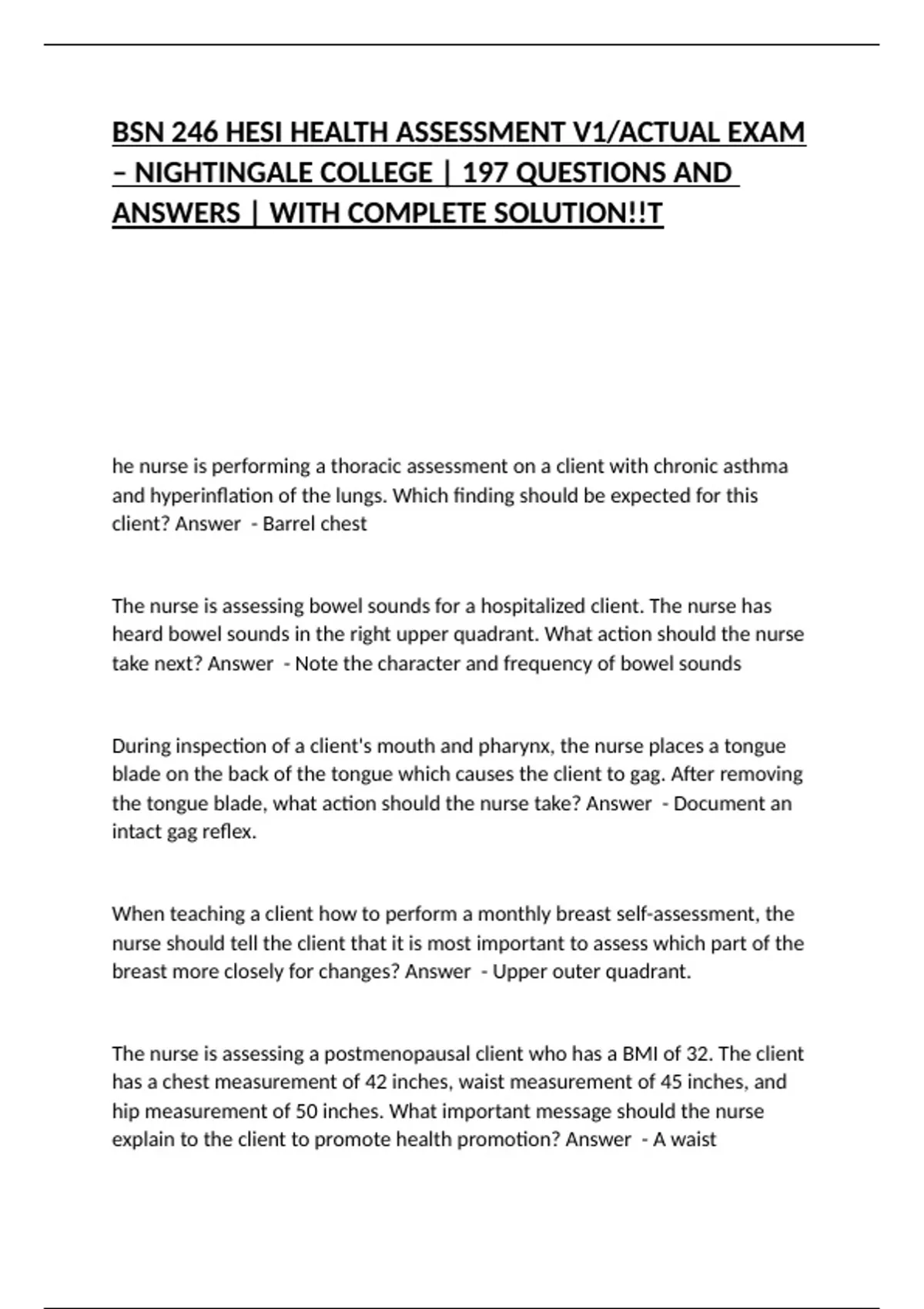 BSN 246 HESI HEALTH ASSESSMENT V1/ACTUAL EXAM