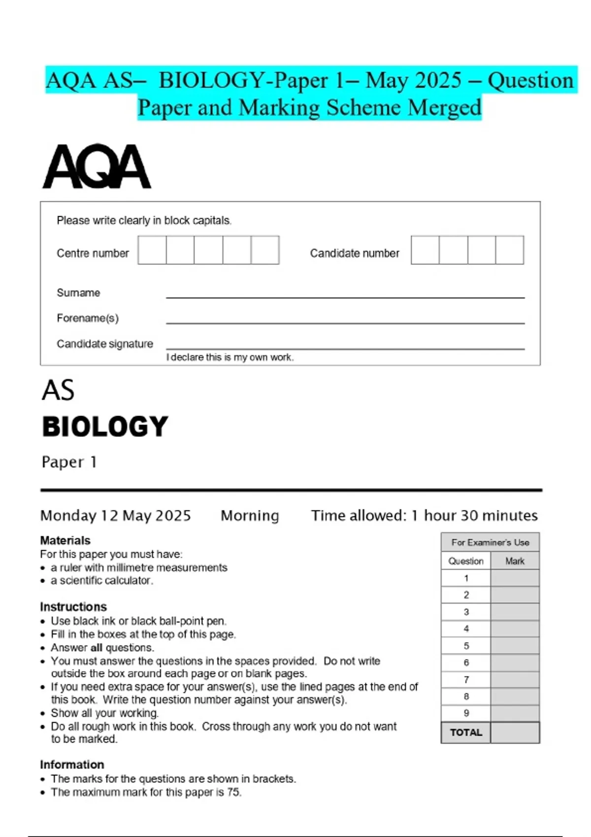 AQA AS- BIOLOGY-Paper 1- May 2025 - Question Paper and Marking Scheme Merged