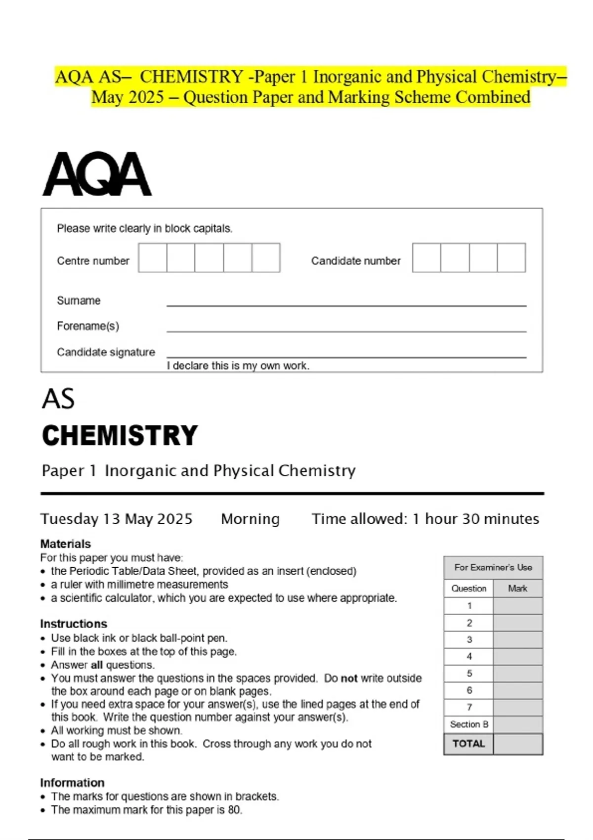 AQA AS- CHEMISTRY -Paper 1 Inorganic and Physical ChemistryMay 2025 – Question Paper and Marking Scheme Combined