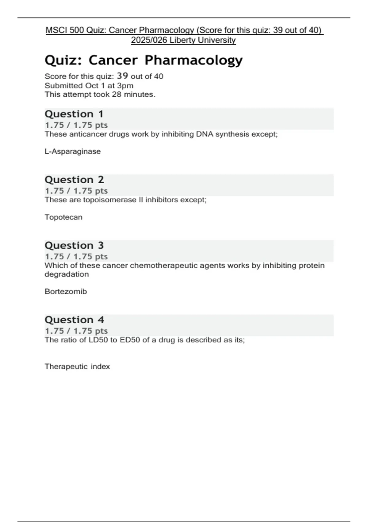 MSCI 500 Quiz: Cancer Pharmacology (Score for this quiz: 39 out of 40) 2025/026 Liberty University