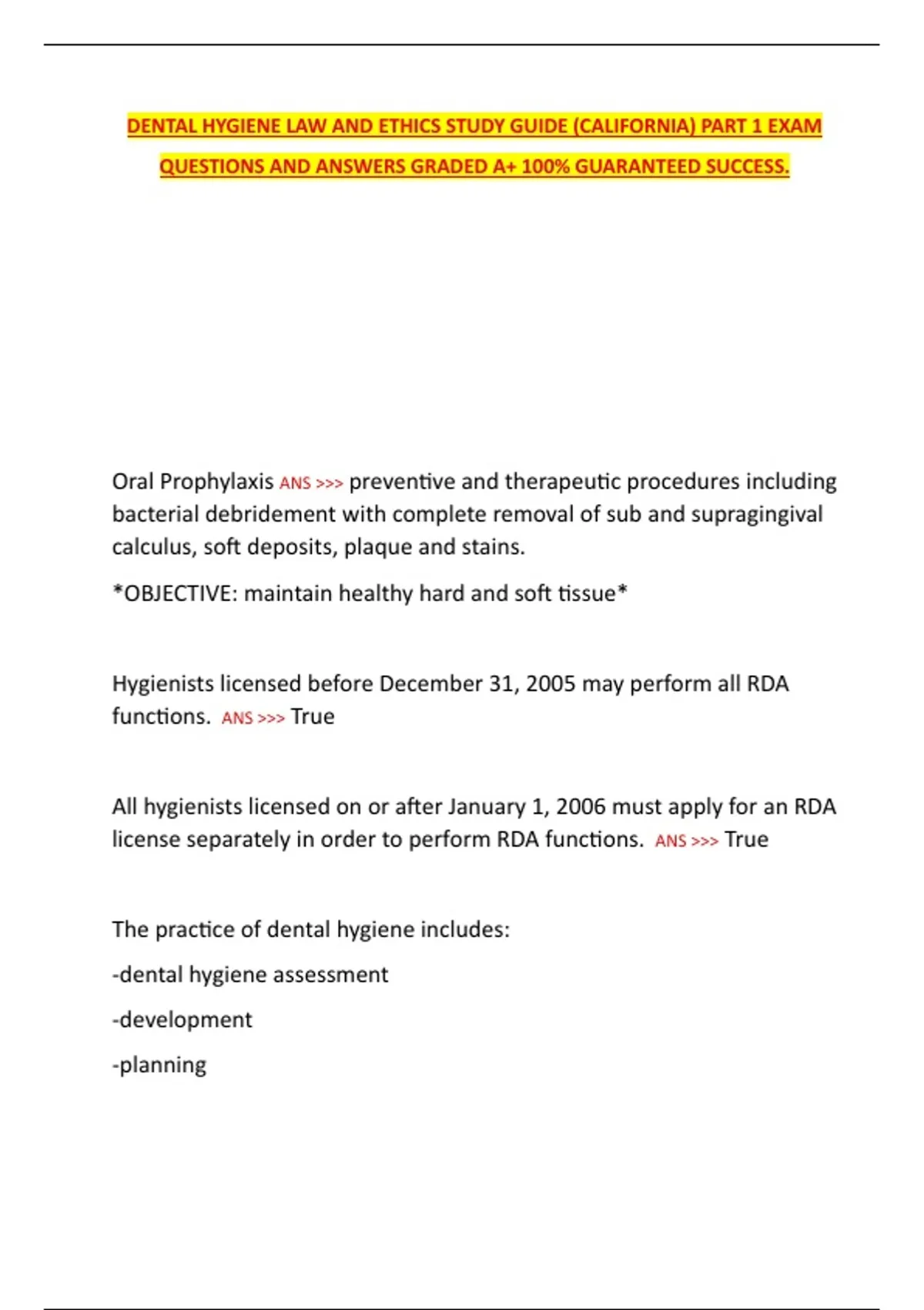 This document provides a verified Part 1 study guide for the California Dental Hygiene Law and Ethics Exam, including accurate questions and correct answers. It covers essential topics such as the Dental Practice Act, scope of practice for RDH and RDHAP, professional conduct, informed consent, patient rights, confidentiality, and ethical decision-making standards in California. The material is structured to reflect real exam expectations and supports confident, successful preparation.