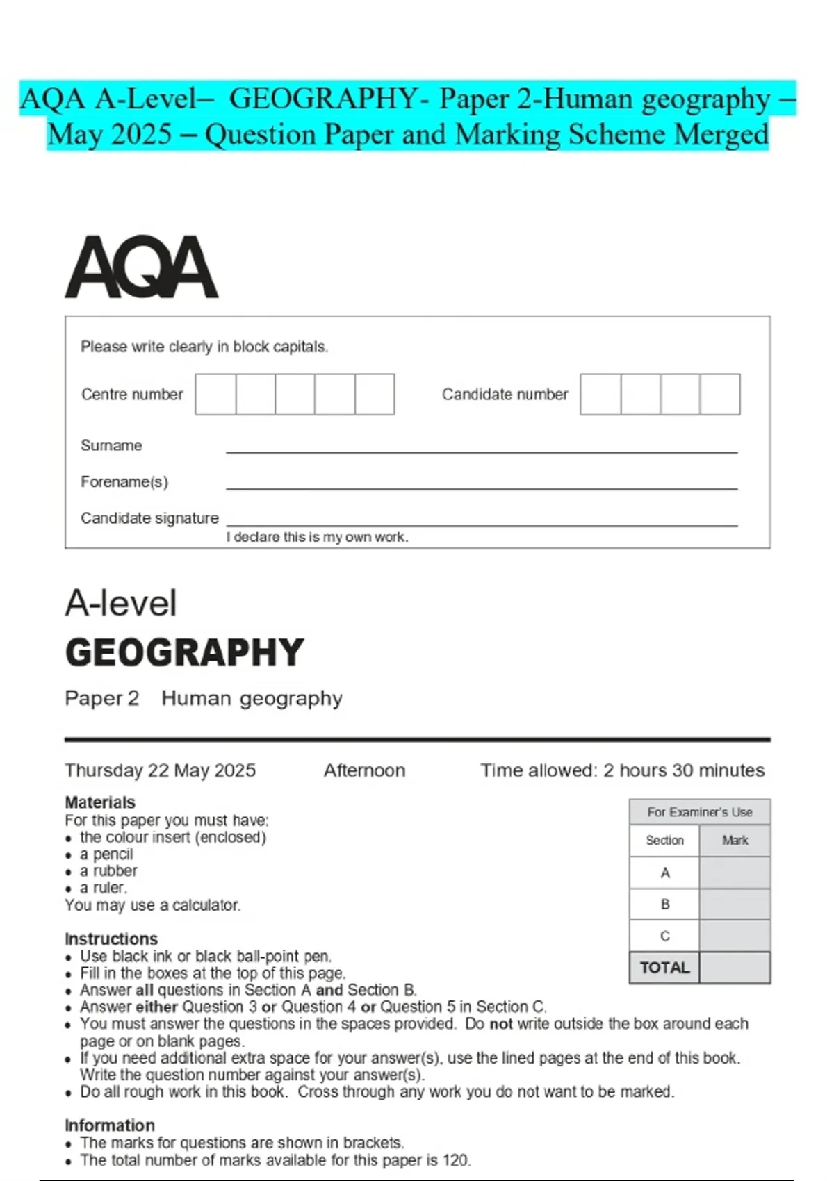 AQA A-Level- GEOGRAPHY- Paper 2-Human geography May 2025 - Question Paper and Marking Scheme Merged