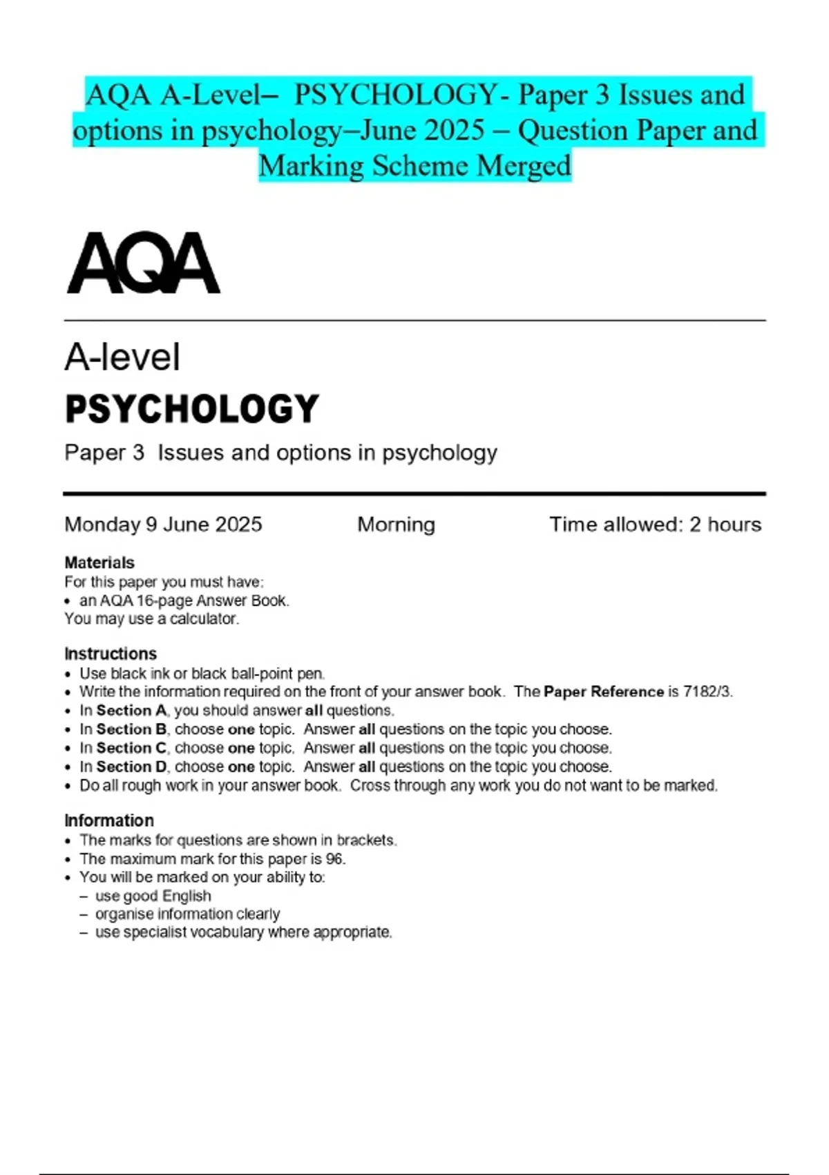 AQA A-Level- PSYCHOLOGY- Paper 3 Issues and options in psychology-June 2025 - Question Paper and Marking Scheme Merged