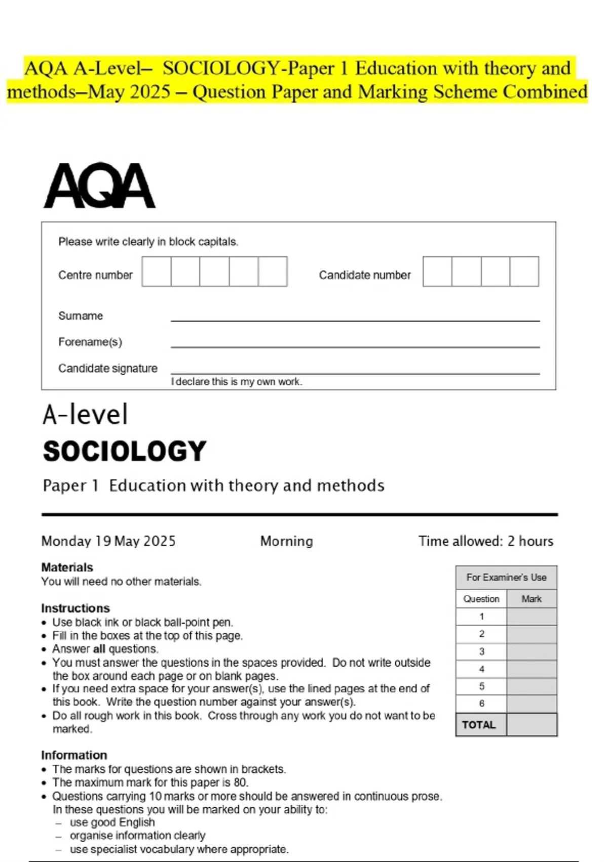 AQA A-Level- SOCIOLOGY-Paper 1 Education with theory and methods-May 2025 - Question Paper and Marking Scheme Combined