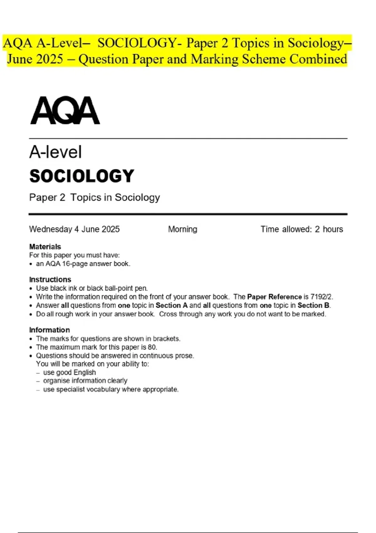 AQA A-Level- SOCIOLOGY- Paper 2 Topics in SociologyJune 2025 - Question Paper and Marking Scheme Combined