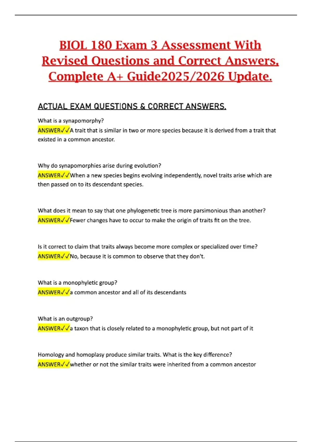 This document provides a fully revised Exam 3 assessment for BIOL 180, featuring updated questions and verified correct answers. It covers the foundational biology concepts, core principles, and introductory topics typically evaluated in the first exam of the course. The material is organized to offer a clear, accurate, and comprehensive review aligned with the 2025/2026 curriculum update.This document provides a fully revised Exam 3 assessment for BIOL 180, featuring updated questions and verified correct answers. It covers the foundational biology concepts, core principles, and introductory topics typically evaluated in the first exam of the course. The material is organized to offer a clear, accurate, and comprehensive review aligned with the 2025/2026 curriculum update.This document provides a fully revised Exam 3 assessment for BIOL 180, featuring updated questions and verified correct answers. It covers the foundational biology concepts, core principles, and introductory topics typically evaluated in the first exam of the course. The material is organized to offer a clear, accurate, and comprehensive review aligned with the 2025/2026 curriculum update.