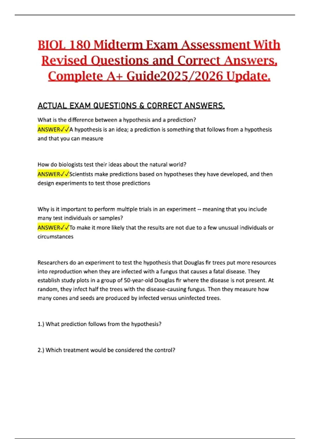 This document provides a fully revised Midterm Exam assessment for BIOL 180, featuring updated questions and verified correct answers. It covers the foundational biology concepts, core principles, and introductory topics typically evaluated in the first exam of the course. The material is organized to offer a clear, accurate, and comprehensive review aligned with the 2025/2026 curriculum update.This document provides a fully revised Midterm Exam assessment for BIOL 180, featuring updated questions and verified correct answers. It covers the foundational biology concepts, core principles, and introductory topics typically evaluated in the first exam of the course. The material is organized to offer a clear, accurate, and comprehensive review aligned with the 2025/2026 curriculum update.This document provides a fully revised Midterm Exam assessment for BIOL 180, featuring updated questions and verified correct answers. It covers the foundational biology concepts, core principles, and introductory topics typically evaluated in the first exam of the course. The material is organized to offer a clear, accurate, and comprehensive review aligned with the 2025/2026 curriculum update.