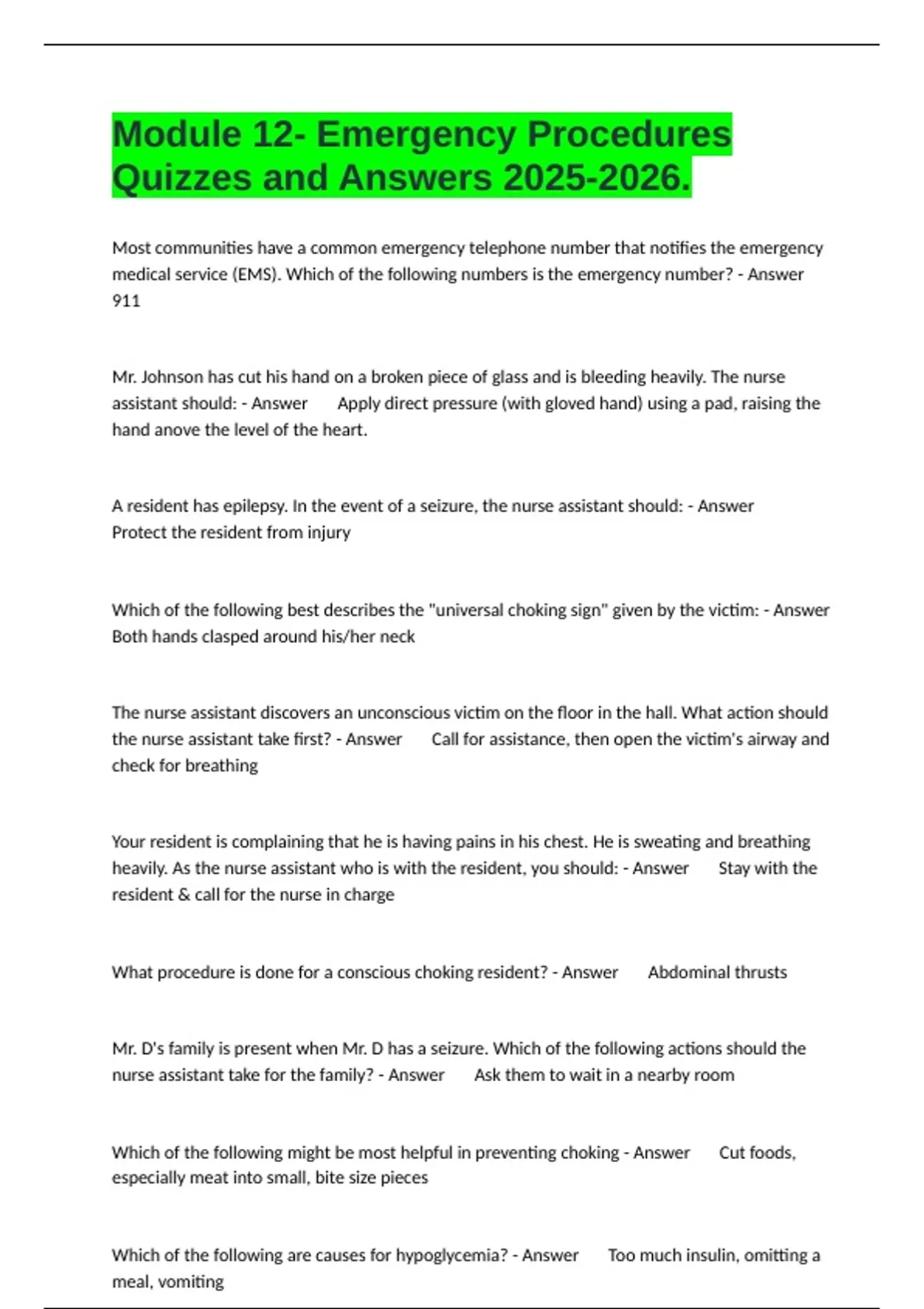 Most communities have a common emergency telephone number that notifies the emergency medical service (EMS). Which of the following numbers is the emergency number? - Answer 911 Mr. Johnson has cut his hand on a broken piece of glass and is bleeding heavily. The nurse assistant should: - Answer Apply direct pressure (with gloved hand) using a pad, raising the hand anove the level of the heart. A resident has epilepsy. In the event of a seizure, the nurse assistant should: - Answer Protect the resident from injury Which of the following best describes the "universal choking sign" given by the victim: - Answer Both hands clasped around his/her neck The nurse assistant discovers an unconscious victim on the floor in the hall. What action should the nurse assistant take first? - Answer Call for assistance, then open the victim's airway and check for breathing Your resident is complaining that he is having pains in his chest. He is sweating and breathing heavily. As the nurse assistant who is with the resident, you should: - Answer Stay with the resident & call for the nurse in charge What procedure is done for a conscious choking resident? - Answer Abdominal thrusts Mr. D's family is present when Mr. D has a seizure. Which of the following actions should the nurse assistant take for the family? - Answer Ask them to wait in a nearby room Which of the following might be most helpful in preventing choking - Answer Cut foods, especially meat into small, bite size pieces Which of the following are causes for hypoglycemia? - Answer Too much insulin, omitting a meal, vomiting Which of the following might be a sign of an obstructed airway? - Answer Inability to speak