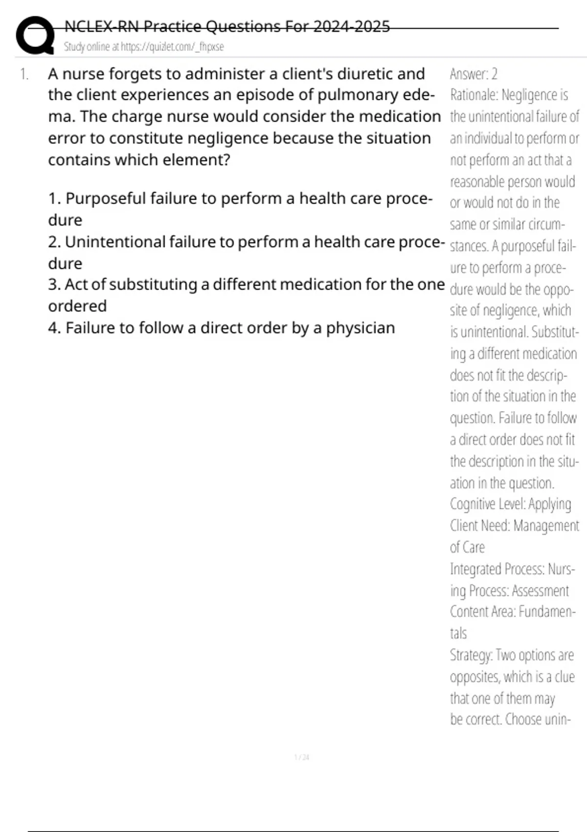 A nurse forgets to administer a client's diuretic and the client experiences an episode of pulmonary ede- ma. The charge nurse would consider the medication error to constitute negligence because the situation contains which element? 1. Purposeful failure to perform a health care proce- dure 2. Unintentional failure to perform a health care proce- dure 3. Act of sub