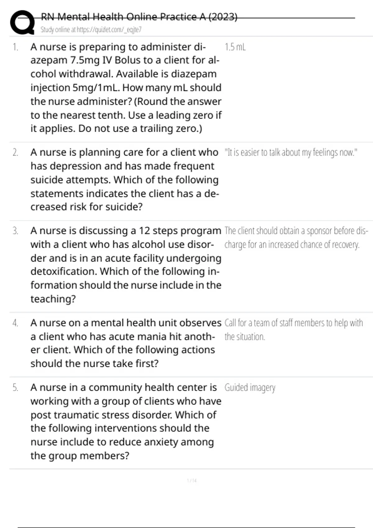 A nurse is preparing to administer di- azepam 7.5mg IV Bolus to a client for al- cohol withdrawal. Available is diazepam injection 5mg/1mL. How many mL should the nurse administer? (Round the answer to the nearest tenth. Use a leading zero if it applies. Do not use a trailing zero.) 1.5 mL 2. A nurse is p