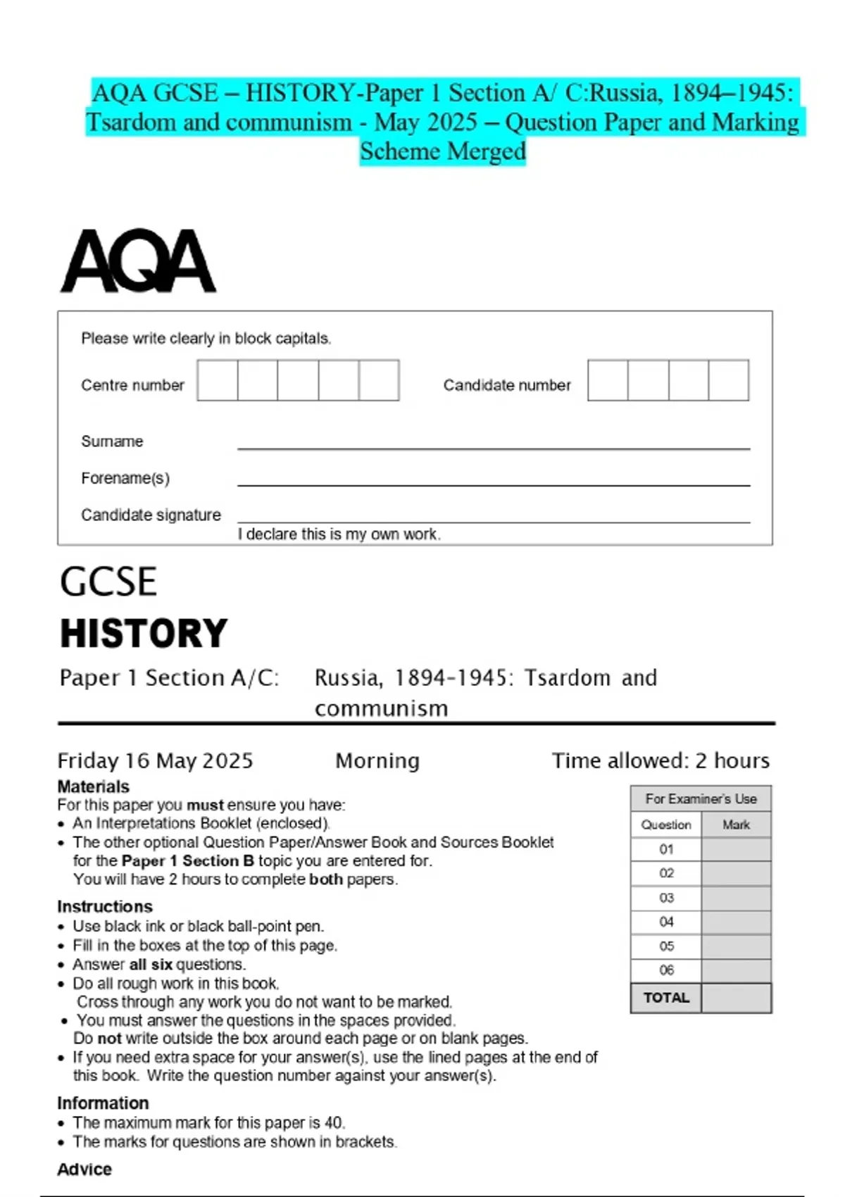 AQA GCSE – HISTORY-Paper 1 Section A/ C:Russia, : Tsardom and communism - May 2025 - Question Paper and Marking Scheme Merged
