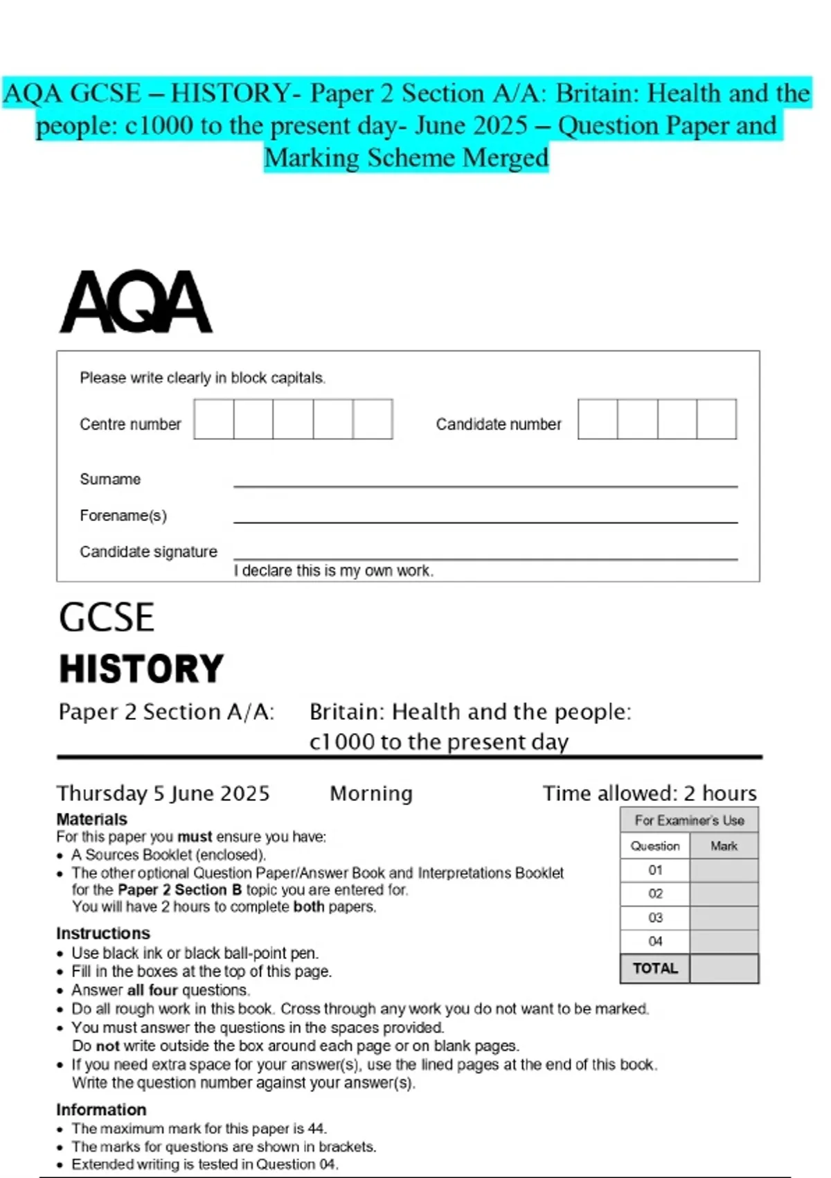 AQA GCSE – HISTORY- Paper 2 Section A/A: Britain: Health and the people: c1000 to the present day- June 2025 – Question Paper and Marking Scheme Merged