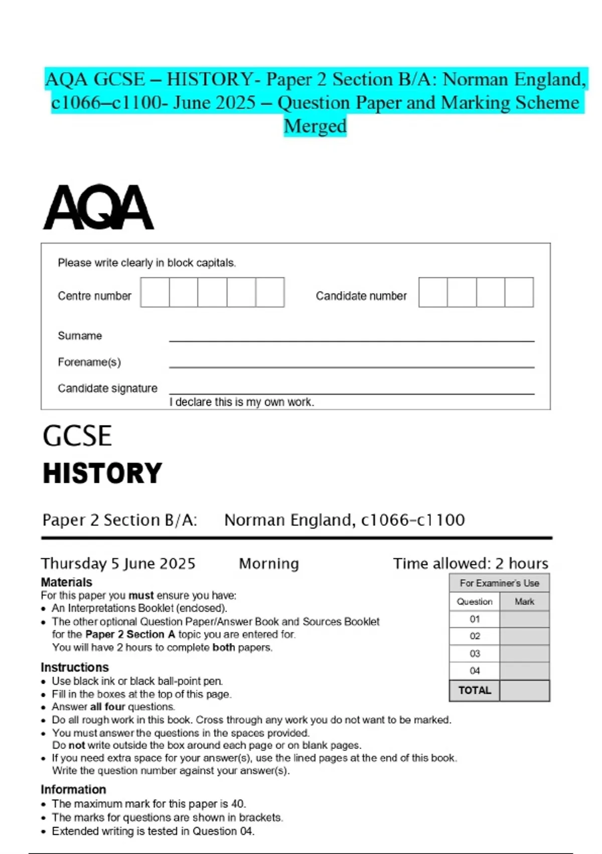 AQA GCSE – HISTORY- Paper 2 Section B/A: Norman England, с1066-c1100- June 2025 - Question Paper and Marking Scheme Merged