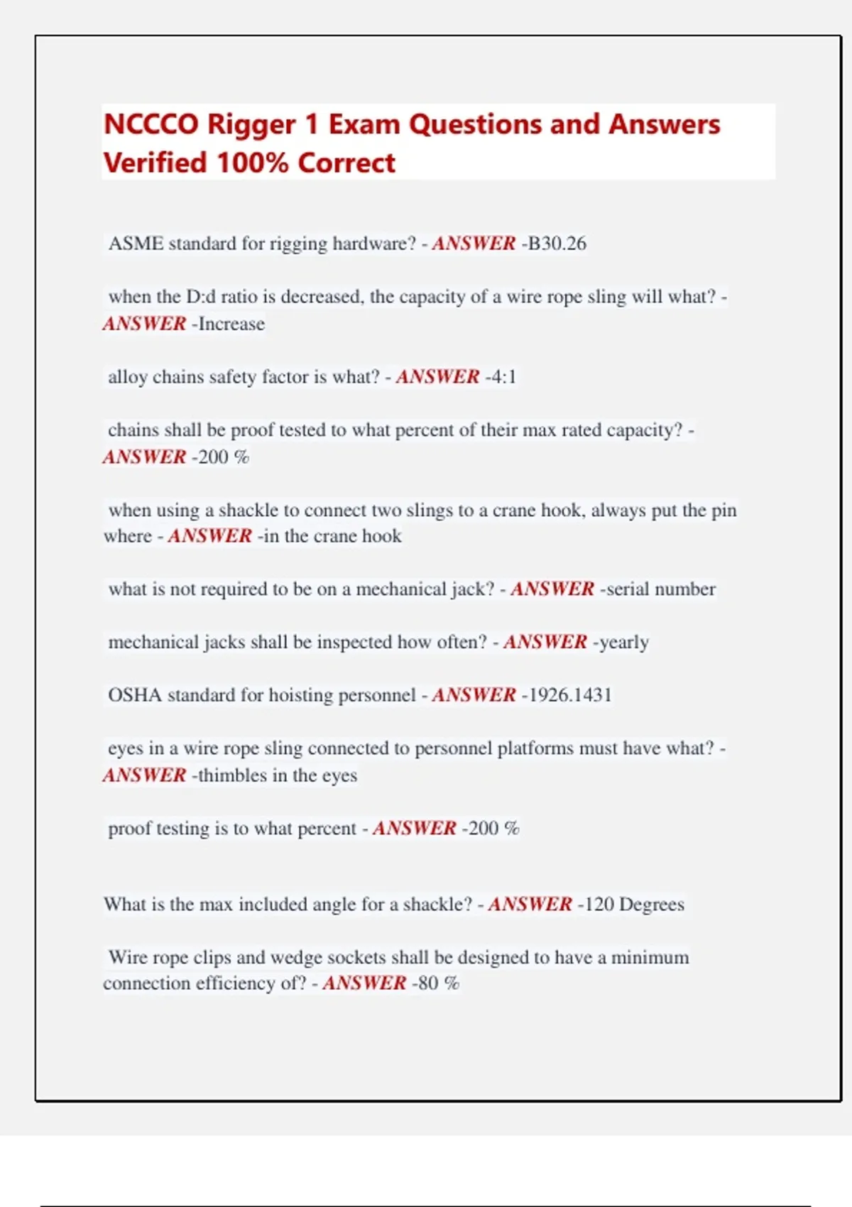 NCCCO Rigger 1 Exam Questions and Answers Verified 100% Correct ASME standard for rigging hardware? - ANSWER -B30.26 when the D:d ratio is decreased, the capacity of a wire rope sling will what? - ANSWER -Increase alloy chains safety factor is what? - ANSWER -4:1 chains shall be proof tested to what percent of their max rated capacity? - ANSWER -200 % when using a shackle to connect two slings to a crane hook, always put the pin where - ANSWER -in the crane hook what is not required to be on a mechanical jack? - ANSWER -serial number mechanical jacks shall be inspected how often? - ANSWER -yearly OSHA standard for hoisting personnel - ANSWER -1926.1431 eyes in a wire rope sling connected to personnel platforms must have what? - ANSWER -thimbles in the eyes proof testing is to what percent - ANSWER -200 % What is the max included angle for a shackle? - ANSWER -120 Degrees Wire rope clips and wedge sockets shall be designed to have a minimum connection efficiency of? - ANSWER -80 % The center of gravity location of a load may _________of the load - ANSWER Not be located on the actual physical body A sling that is rigged at 30 degrees to the load will be subjected to an increase sling tension of? - ANSWER -200 % Using a wire rope sling in a choker hitch configuration, the capacity will be how much less than a straight line hitch? - ANSWER -25 % The capacity of the vertical basket hitch is generally considered to be blank percent of the straight line vertical hitch capacity? - ANSWER -200 % in the D:d ratio the uppercase D stands for what? - ANSWER -Diameter of the object the sling will pass around As a general rule, the smaller the D:d ratio applied to a wire rope sling's body, - ANSWER -the more the slings capacity is reduced When the distance between sling attachments and sling length are the same, then what is the sling angle? - ANSWER -60 degrees The distance between sling attachment points, multiplied by .75 will result in the approximate sling length for a _____sling angle - ANSWER -45 degree Shackles WLL up through 4" must be what safety factor? - ANSWER -5:1 Over 4 inches safety factor is what? - ANSWER -4:1 what can slings be safely connected to each other with? - ANSWER -shackles the eye of a wire rope sling should not be placed on a hook or pin that is larger than what? - ANSWER -1/2 the slings eye length