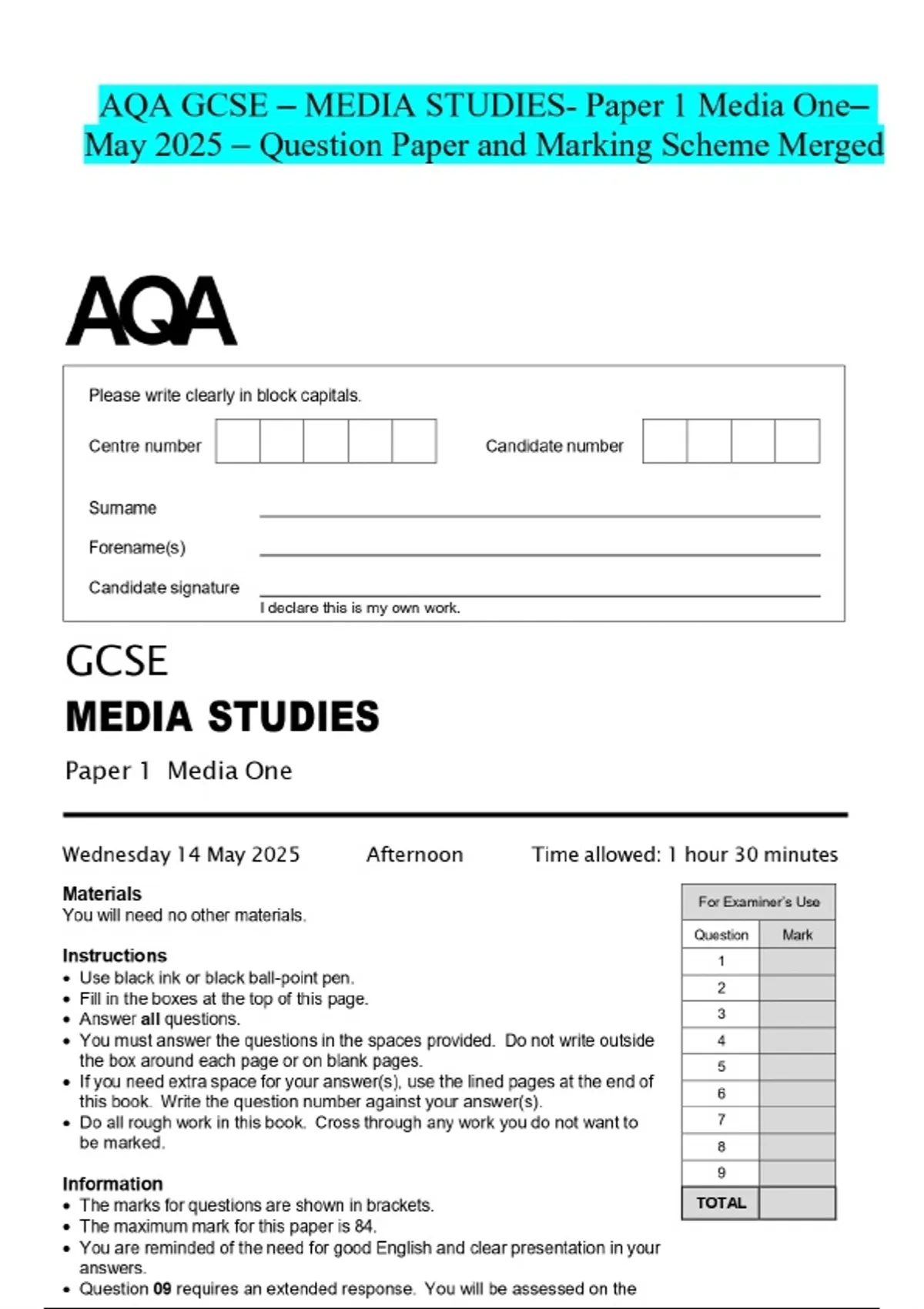 AQA GCSE – MEDIA STUDIES- Paper 1 Media OneMay 2025 - Question Paper and Marking Scheme Merged