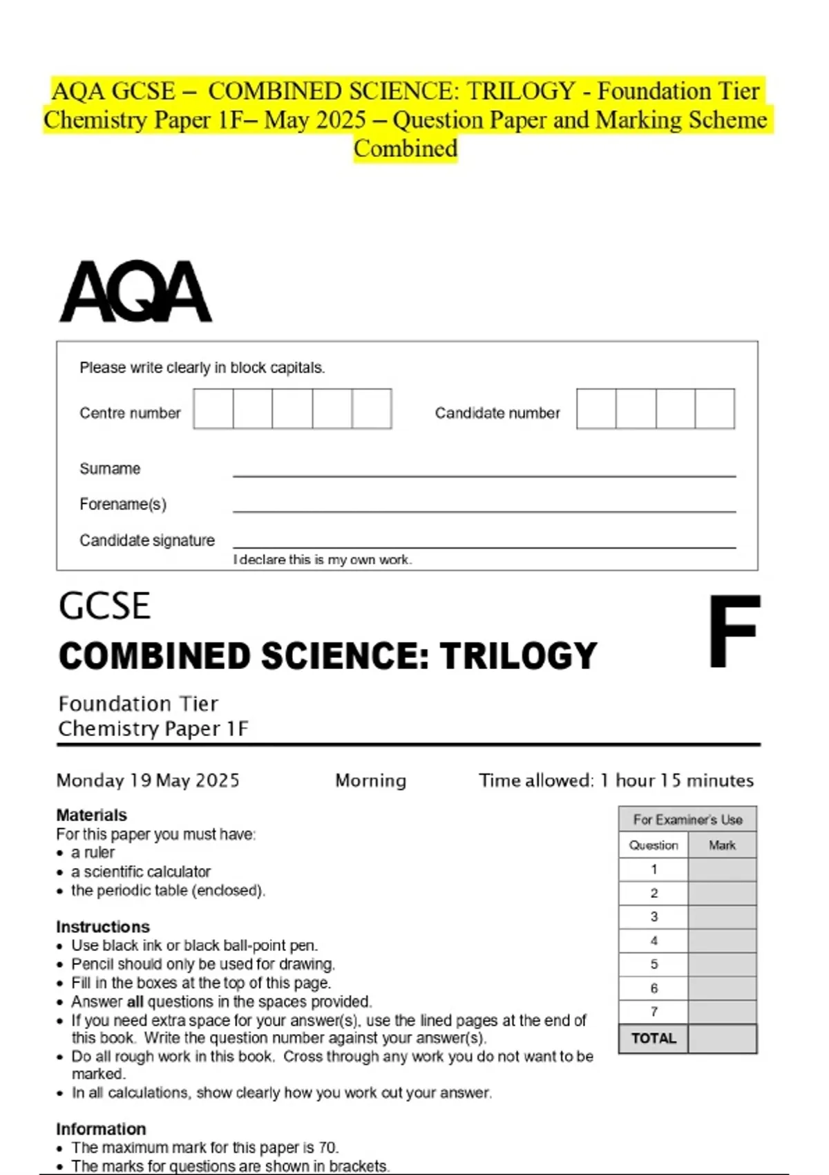 AQA GCSE - COMBINED SCIENCE: TRILOGY - Foundation Tier Chemistry Paper 1F- May 2025 - Question Paper and Marking Scheme Combined