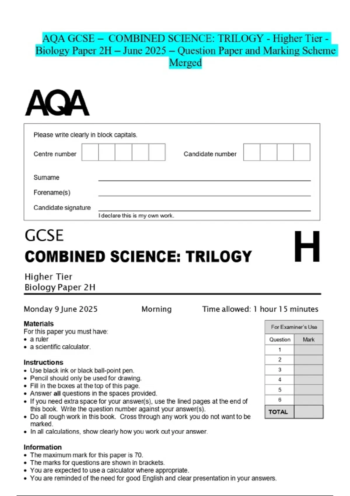 AQA GCSE - COMBINED SCIENCE: TRILOGY - Higher Tier - Biology Paper 2H - June 2025 – Question Paper and Marking Scheme Merged