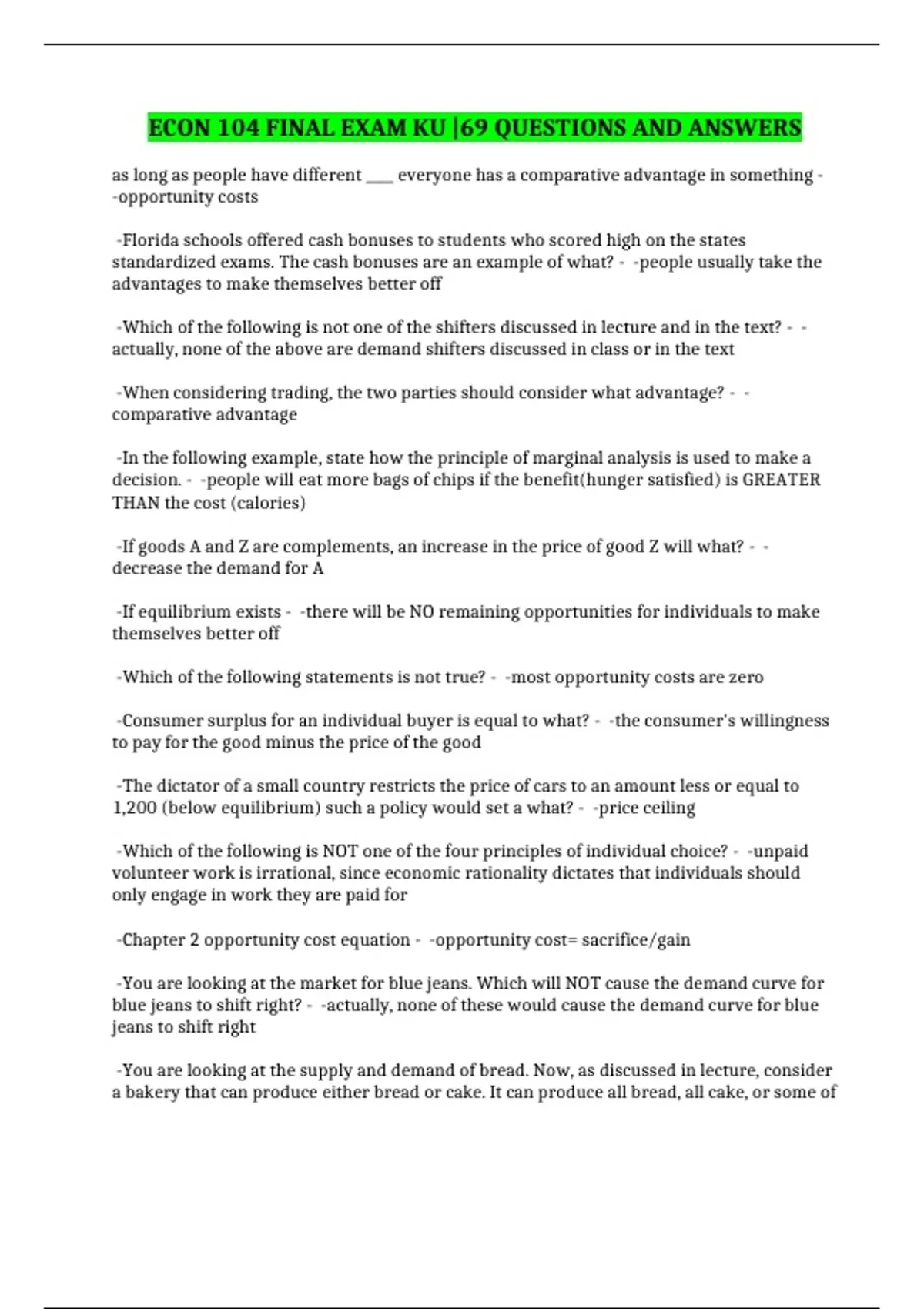 ECON 104 FINAL EXAM KU |69 QUESTIONS AND ANSWERS